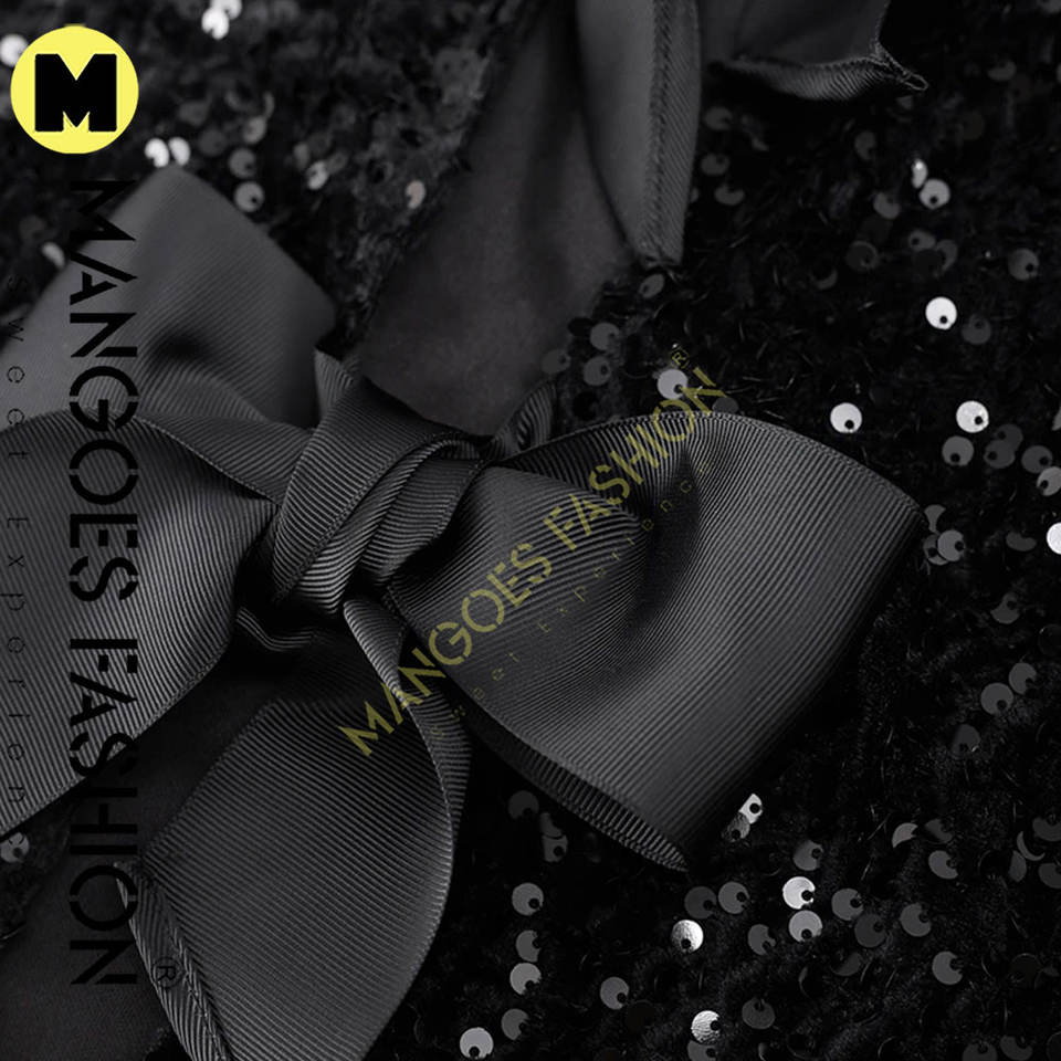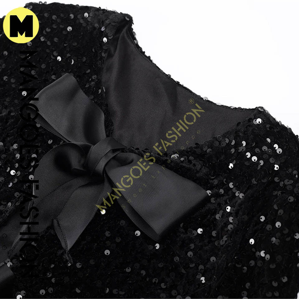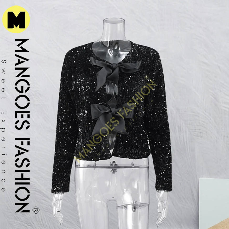 Chic Shiny Sequin Bow Lace up Veste pour femme-Manteau court avec col rond et manches longues Parfait pour les fêtes et les événements
