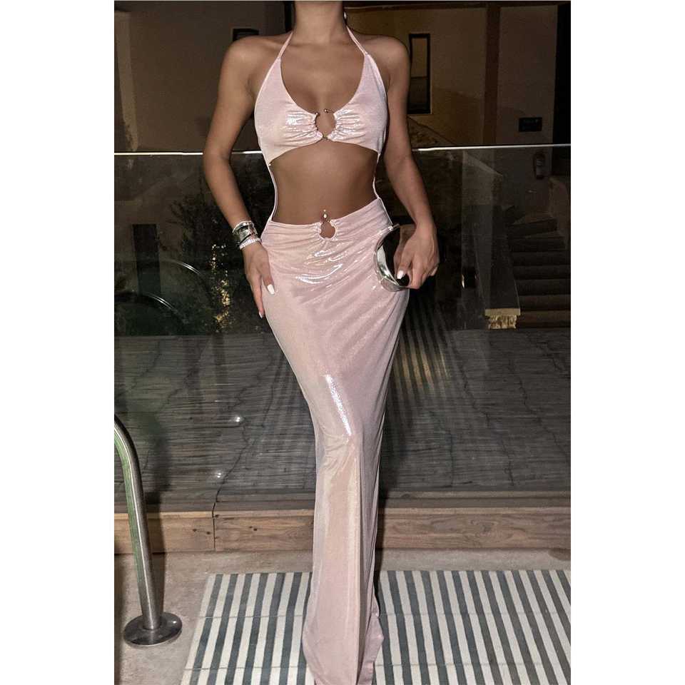 Robe de soirée longue à sequins, style empire, rose poudré, avec détails de fenêtre, chic et simple, pour les occasions formelles et les fêtes