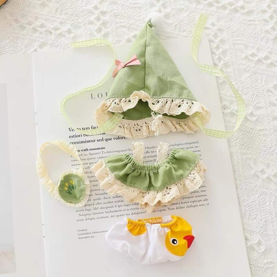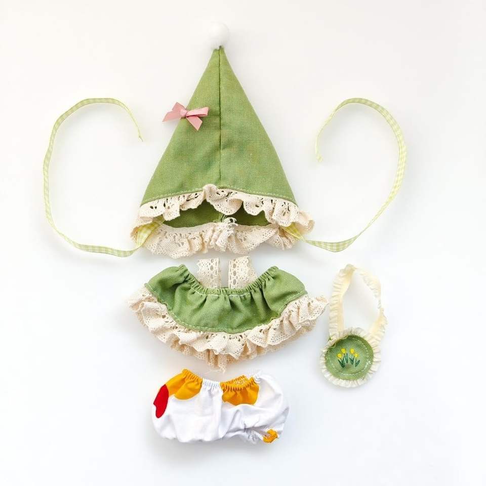 MaiTianna Ensemble de robe de poupée de 17cm de style chic Chapeau d'elfe vert avec haut en dentelle et bretelles Ensemble de quatre pièces pour les 18 mois et plus