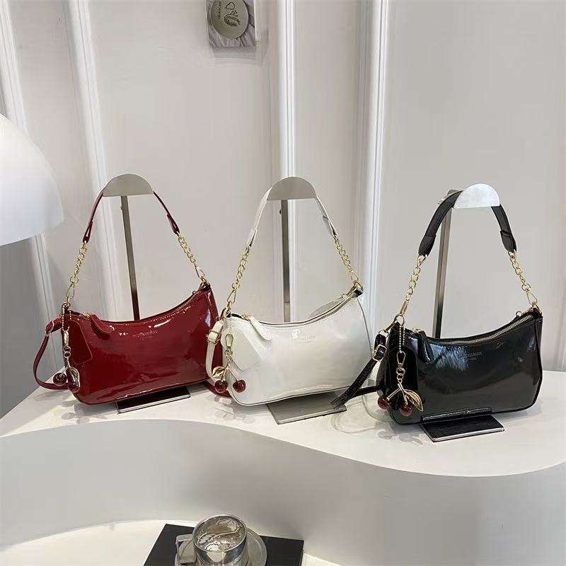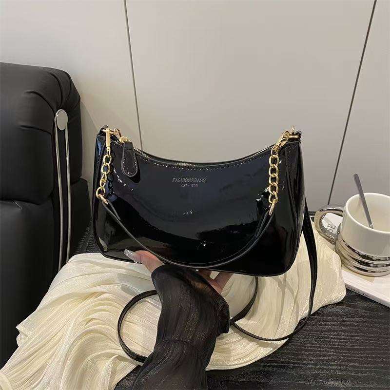 Sac en cuir chic en forme de croissant avec finition brillante et délicate sangle de chaîne polyvalente pour les épaules ou les aisselles