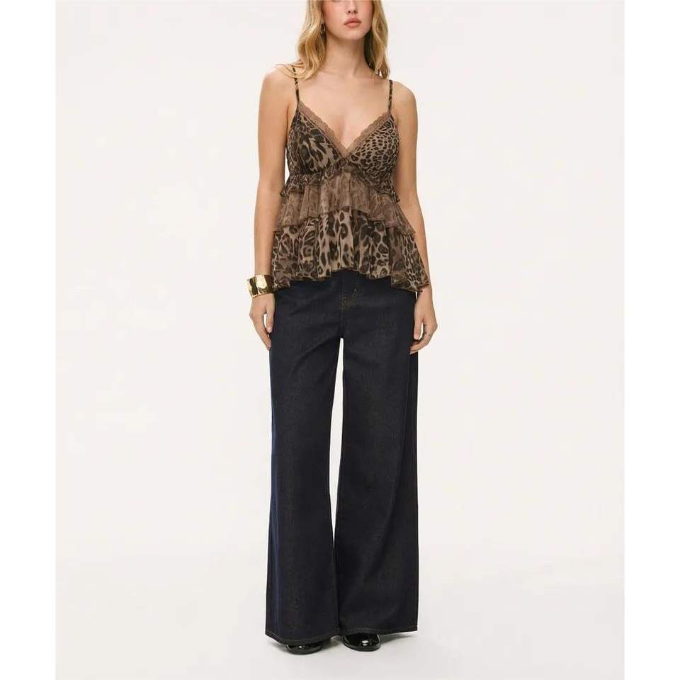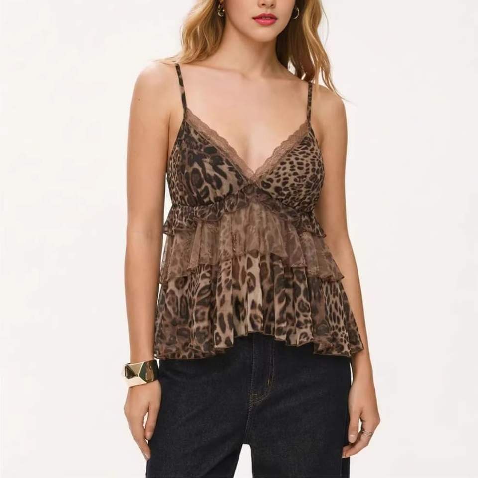 Chemise de nuit une pièce en mousseline imprimé guépard pour femme, style babydoll, dos nu, sans manches, avec bordure en dentelle douce, mode estivale
