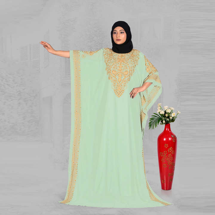 Kaftan Modeste en Mousseline Brodé avec Détails Frontaux Complexes, Manches Imposantes, Silhouette Fluide Longue – Idéal Aïd, Ramadan, Quotidien