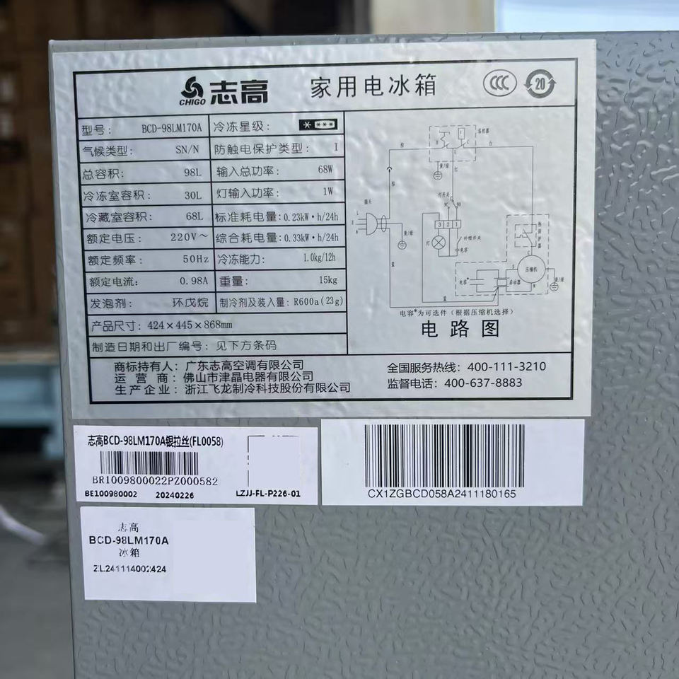 Mini Bar Réfrigérateur Double Porte Chigo 98L pour Chambres d'Hôtel et Usage Domestique Prix Économique Froid Direct Congélateur Supérieur Dimensions Net 42*44*86cm