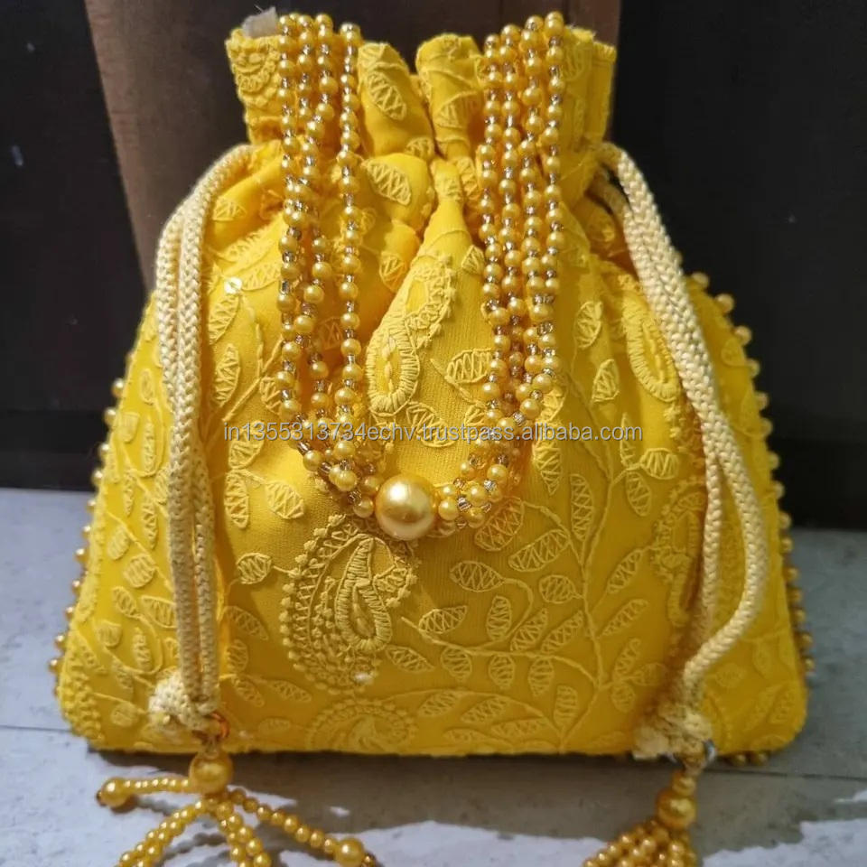 Sac à main indien fait main brodé Chikankari, unisexe, doublure en coton satiné, cadeau de mariage/faveur de fête, pochette à monnaie Potli avec cordon