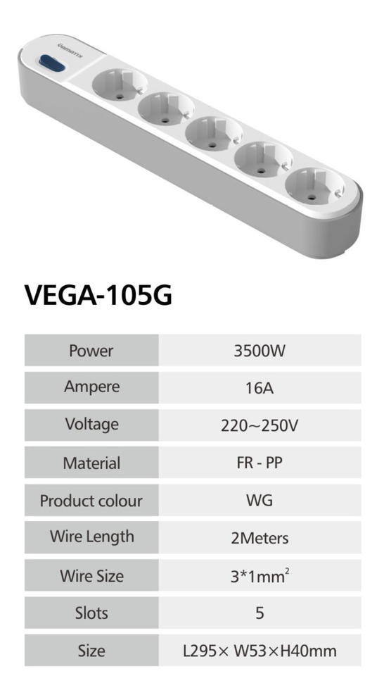 Prise de courant multiprise 5 sorties VEGA105 16A avec obturateur de sécurité enfant, matériau ignifuge FR-PP, câble en cuivre, fournisseur d'usine