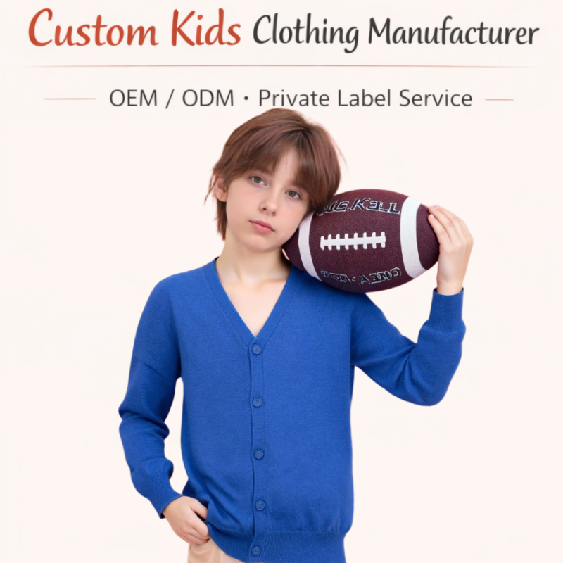 Vêtements pour enfants, toucher doux, mélange de laine de luxe, OEM, étiquette privée, uniforme scolaire, décontracté, bleu royal, cardigan en tricot à col en V pour enfants