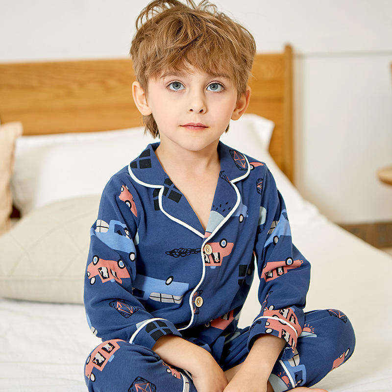 Children Cotton Cardigan Pajamas for Boys Casual Sleepwear with Custom Cartoon Pattern Long Sleeve Top and Long Pants Home Set