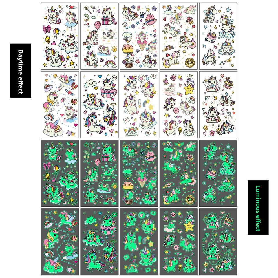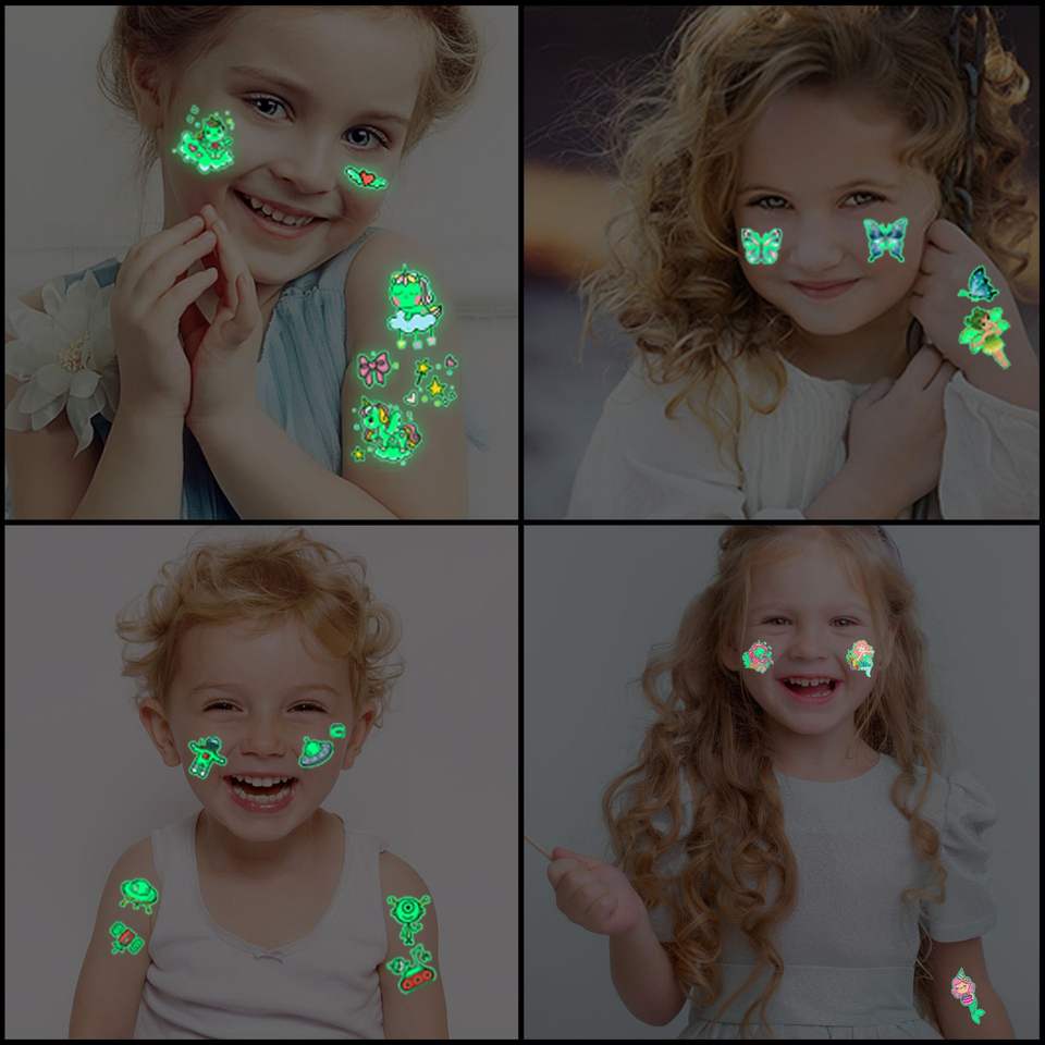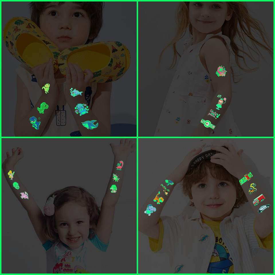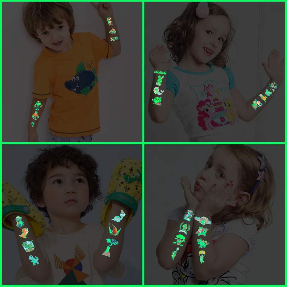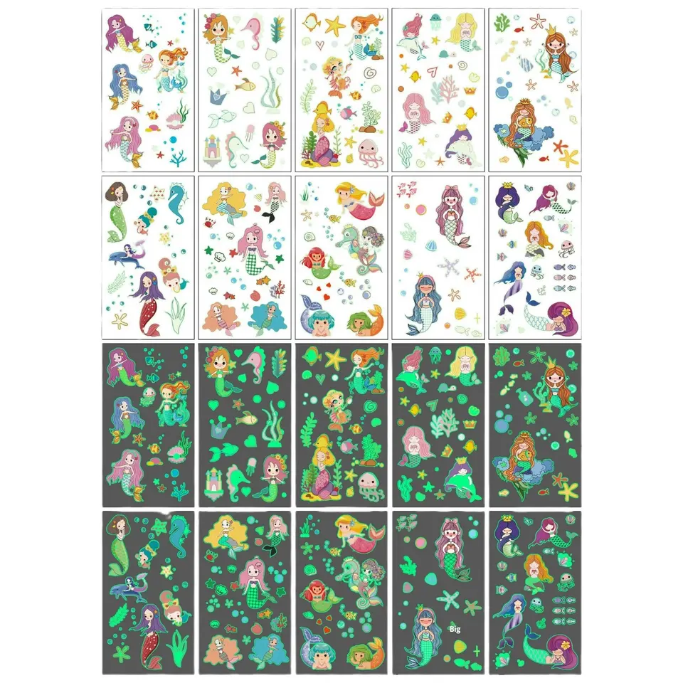 Autocollants de tatouage temporaires pour enfants, dessins animés de dinosaures et de sirènes, transfert d'eau, papier lumineux, corps, impression blanche transfrontalière