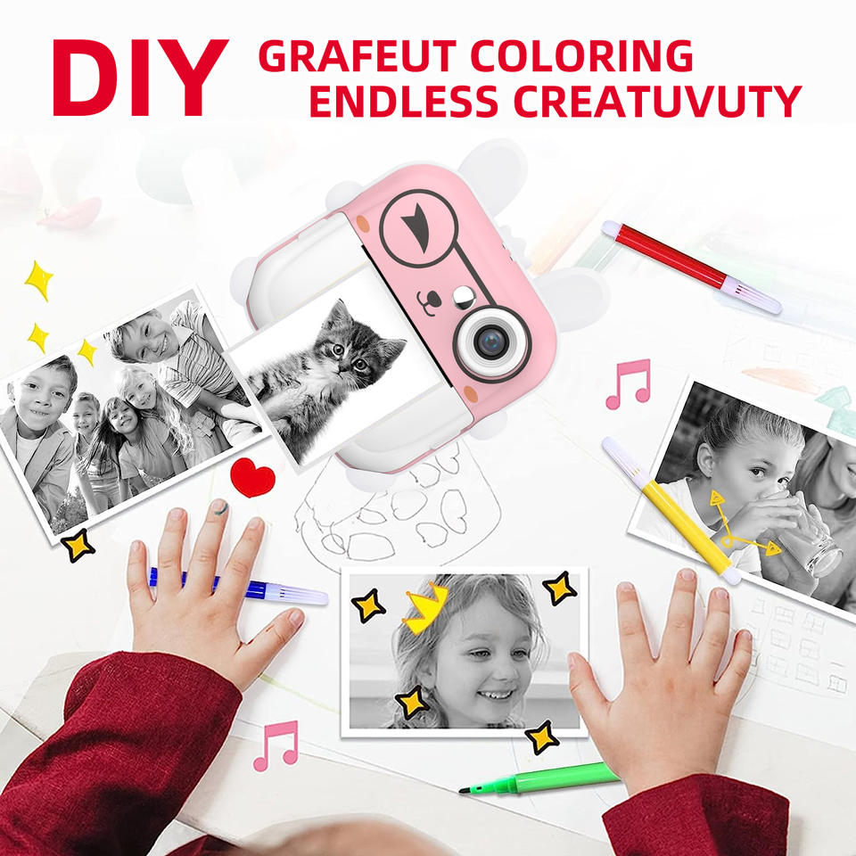 Appareil photo instantané pour enfants 320x240p Imprimante photo Mini appareil photo thermique avec filtre Selfie TF Écran 2,4 pouces 128 Go de mémoire intégrée