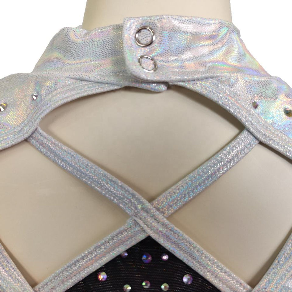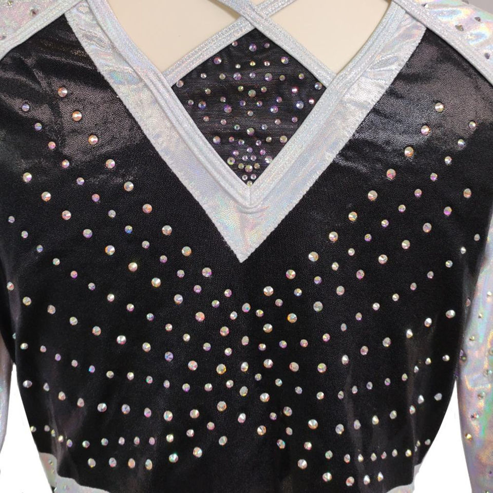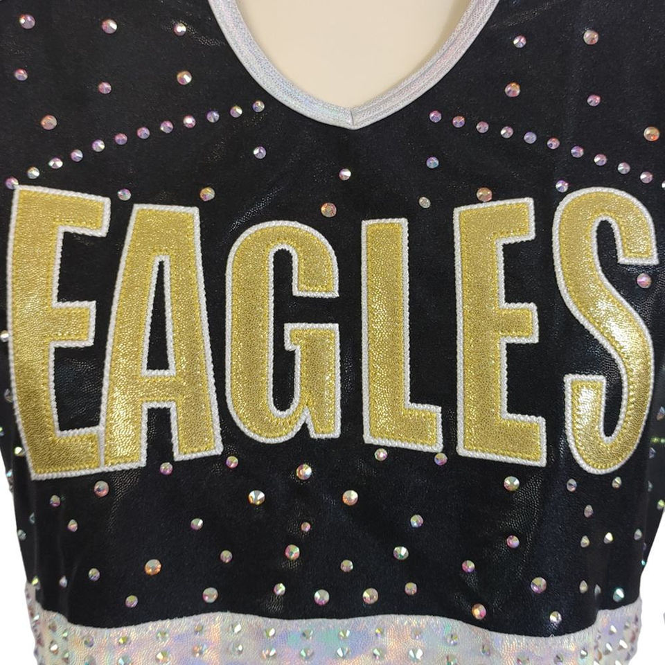 Uniforme de cheerleading personnalisé pour enfants en polyester et élasthanne, broderie 3D sur le devant, strass, impression par transfert thermique, noir et or
