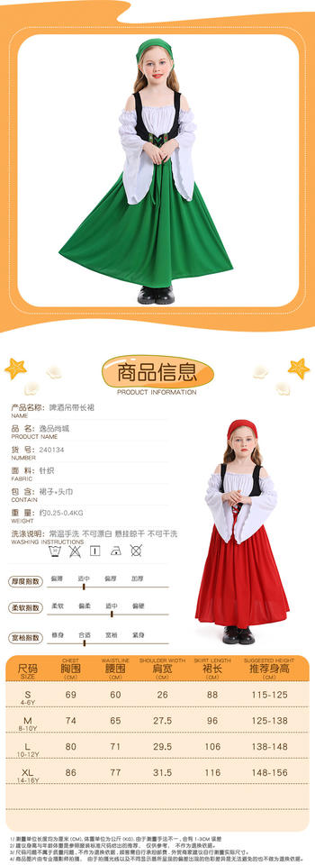 Costume de Jeune Fille de Ferme Médiévale pour Enfants - Jupe Longue Bavaroise avec Tablier et Chemise pour Jeu de Rôle