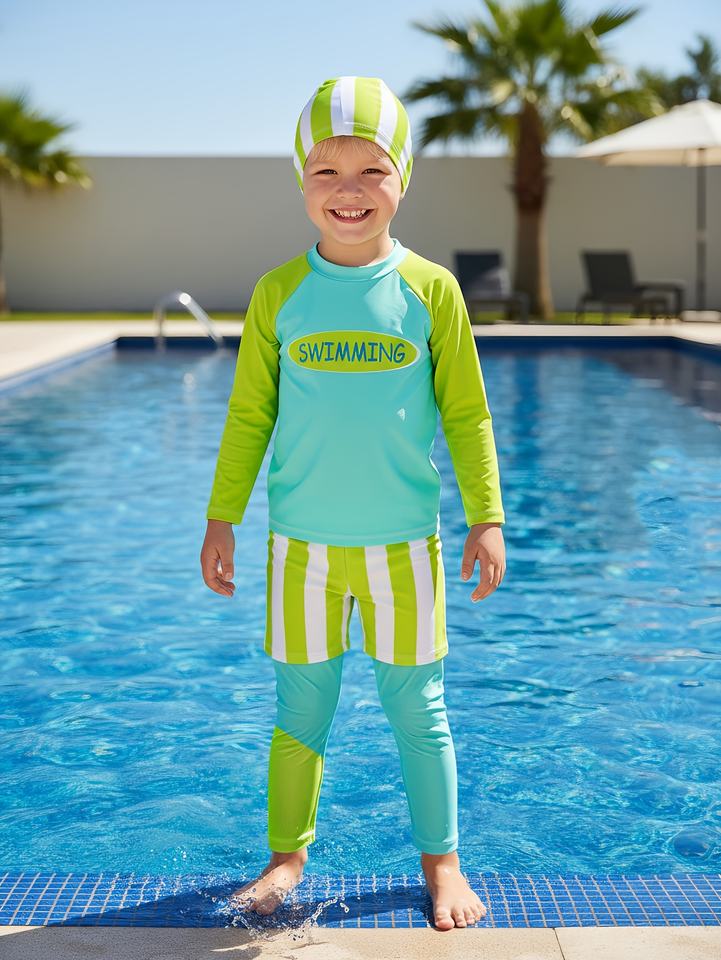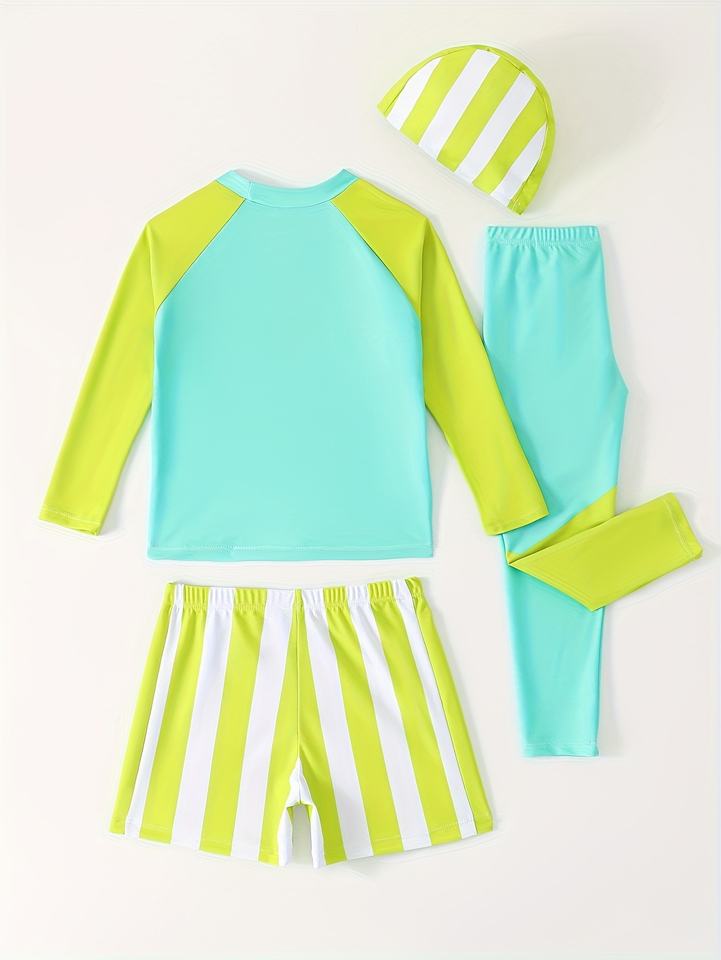 Maillot de bain deux pièces pour enfants avec bonnet de bain, pantalon à manches longues, protection solaire pour la plage, ensemble de quatre pièces pour la natation
