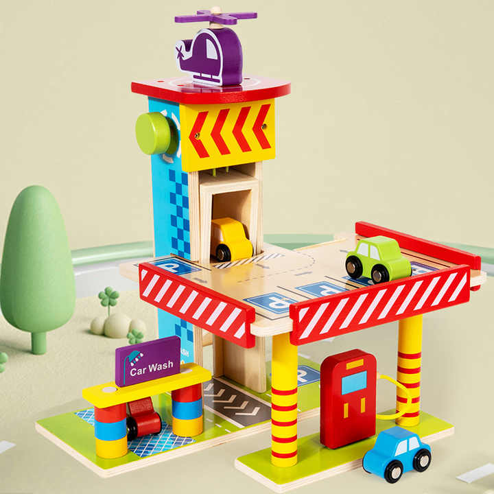 Maison de jeu en bois pour enfants Simulation Parking Grand assemblage à trois couches Voiture Piste coulissante Avion Jouet de levage