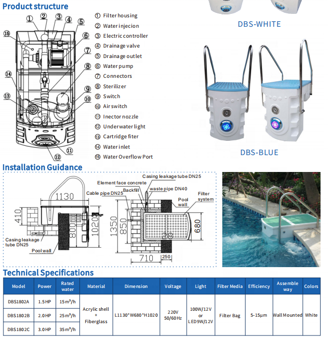 Filtration intégrée de filtre à eau de piscine d'usine de la Chine à vendre et fixé au mur et aucun filtre de piscine de pièce de machine de besoin