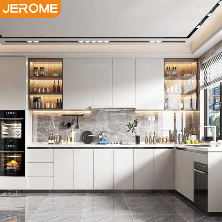 Usine JEROME de Foshan en Chine, armoires de cuisine modulaires en bois sur mesure, armoires de cuisine modernes blanches intégrées avec portes en verre