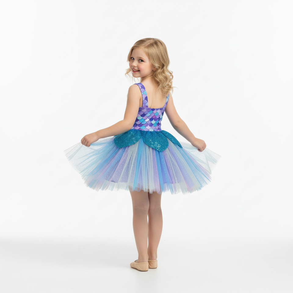 Robe de danse de scène pour enfants inspirée de la sirène Ariel, tutu de ballet bleu-violet avec corsage à écailles et jupe en tulle scintillante pour récitals et fêtes