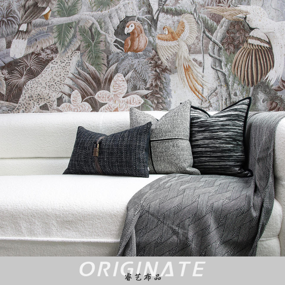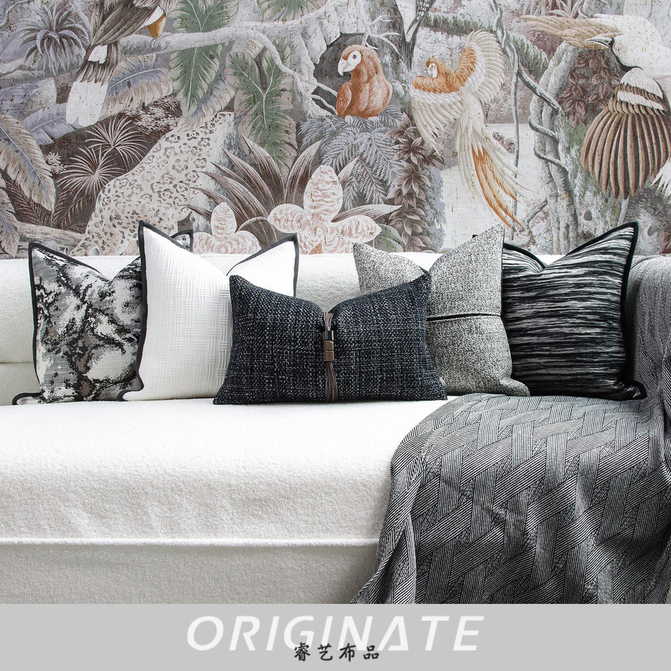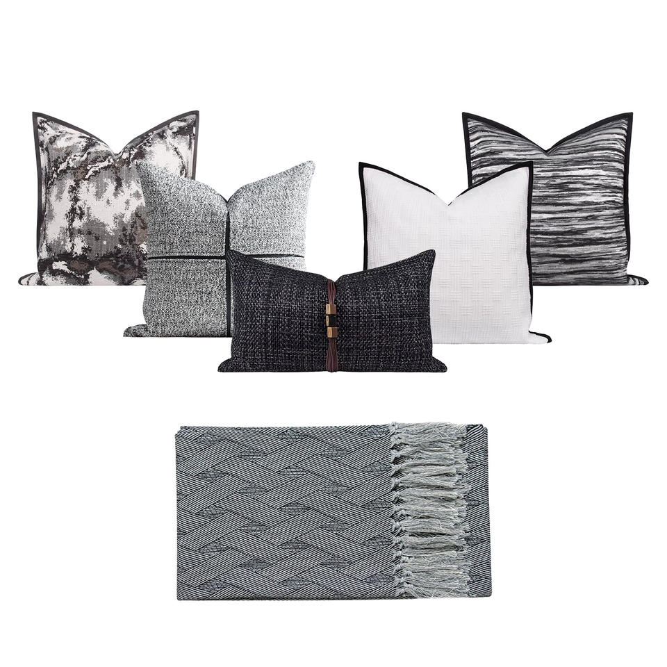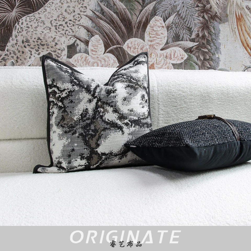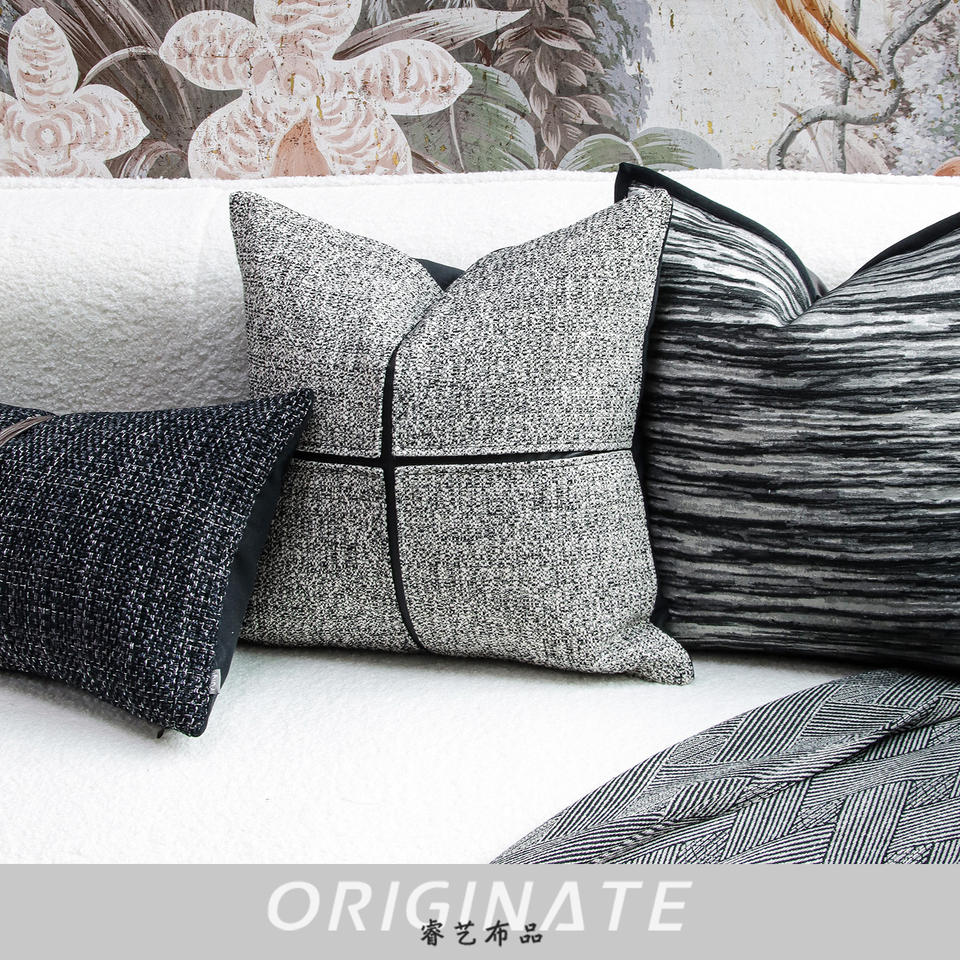 Canapé à motif géométrique et portrait de luxe chinois léger avec oreillers à mémoire personnalisés à l'encre noire grise et blanche pour salon hôtel