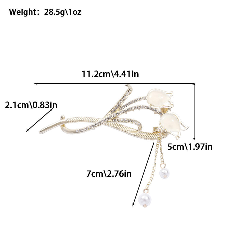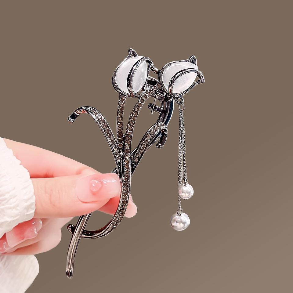 Pince à cheveux chinoise en strass motif fleur de tulipe, avec chaîne à pampilles en perles et pierre œil de chat, pour femmes