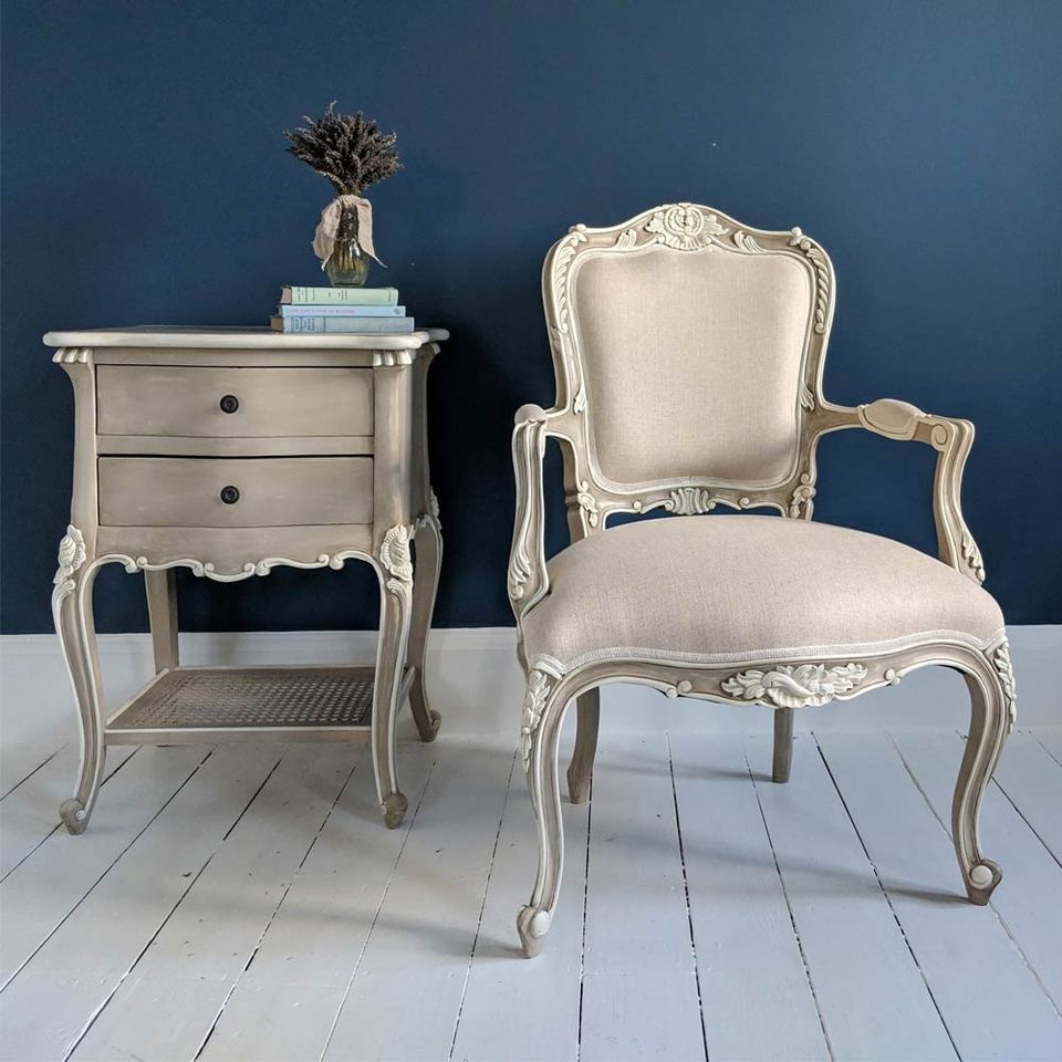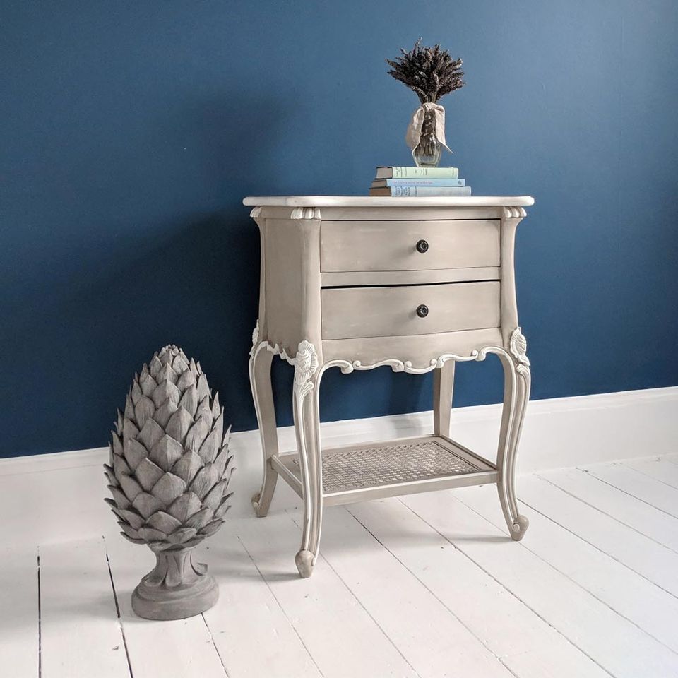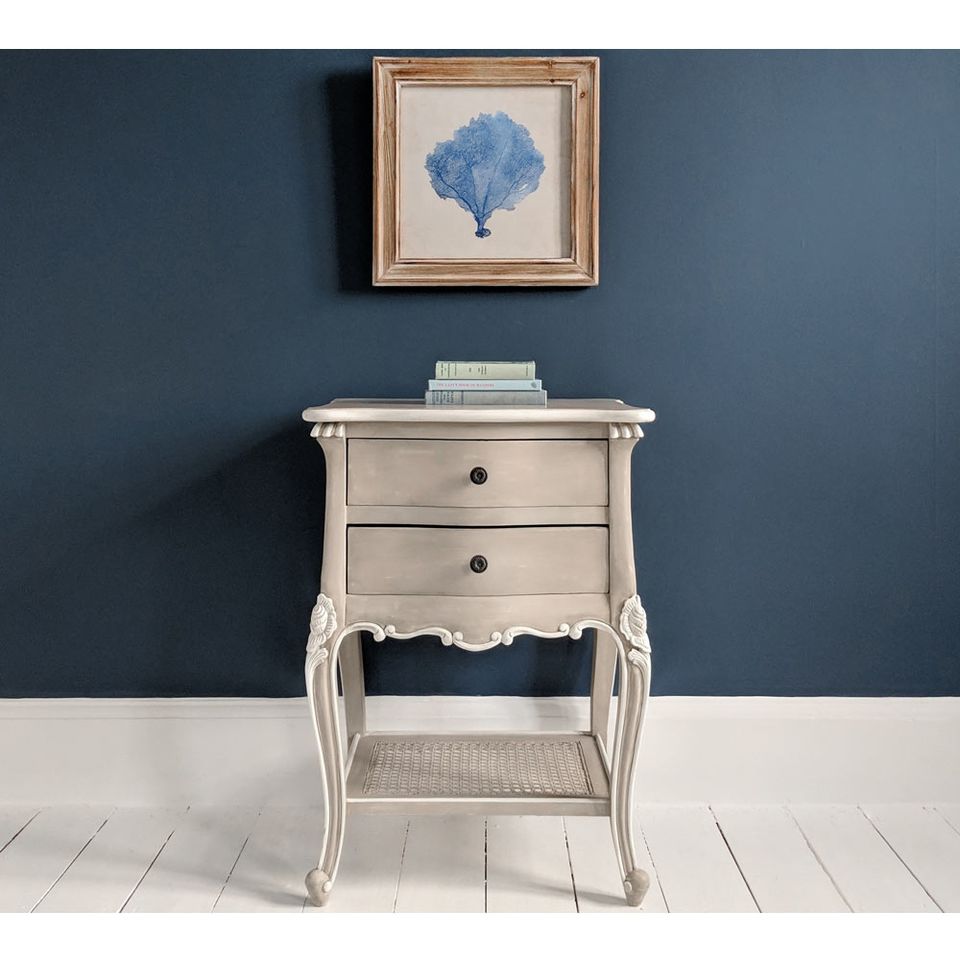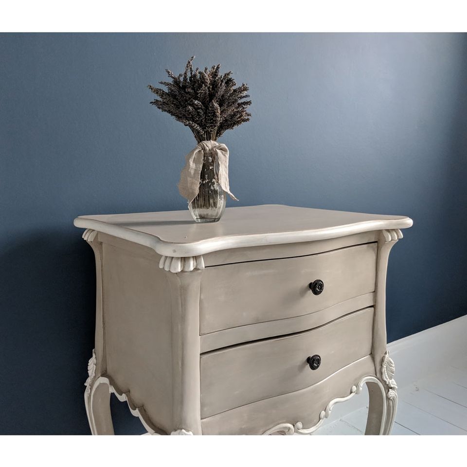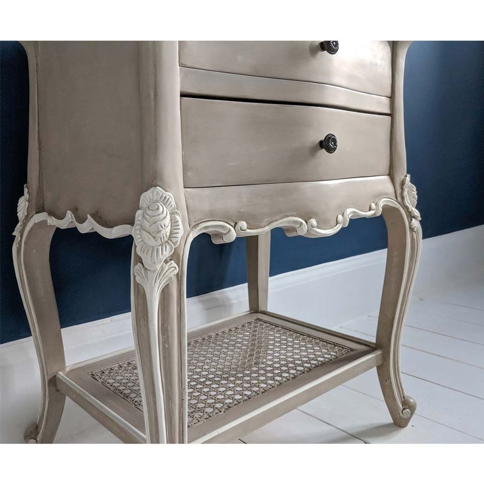 Table de chevet Christabel en bois massif de style français, gris fauve et ivoire, avec deux tiroirs