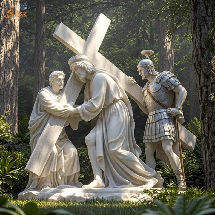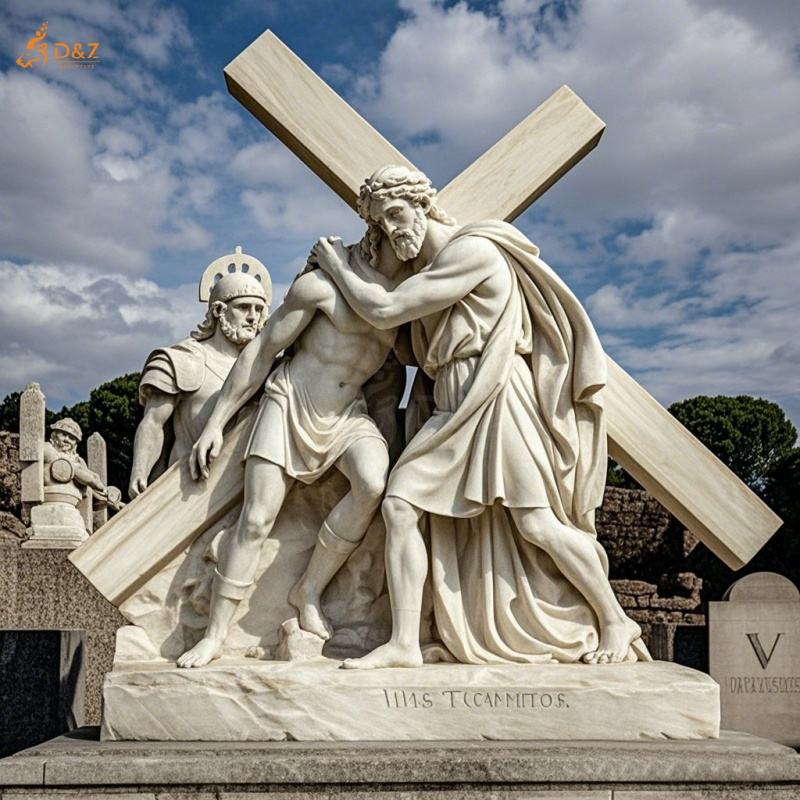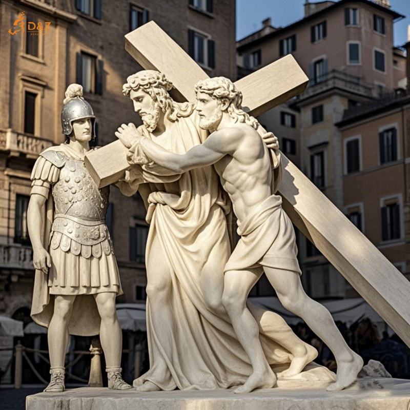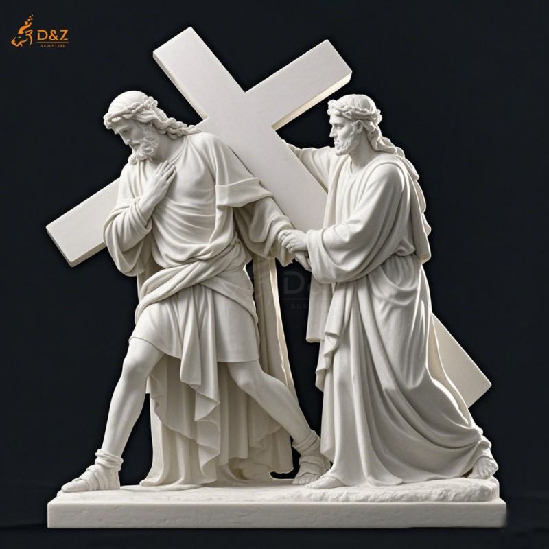 Chrétien Catholique Célèbre Grande Pierre Sculpter Jésus 14 Stations Cinquième Station Marbre Blanc Simon Aide Jésus Porter Croix Sculpture