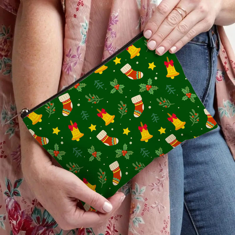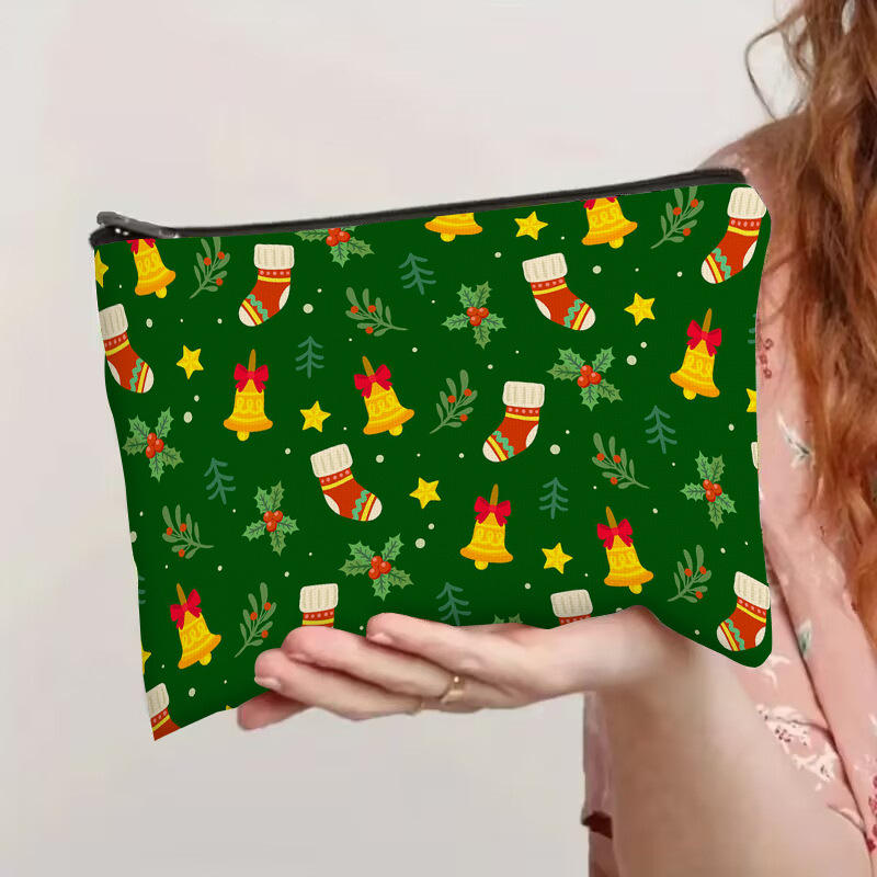 Sac de maquillage en polyester imprimé 3D de dessin animé de cloche de Noël à la mode fermeture à glissière double face Portable transfrontalier