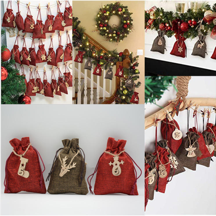 Christmas Holiday Supplies Wine Red Coffee Set with 24 Wooden Labels Advent Calendar Burlap Bag for Gift Candy Packaging Storage