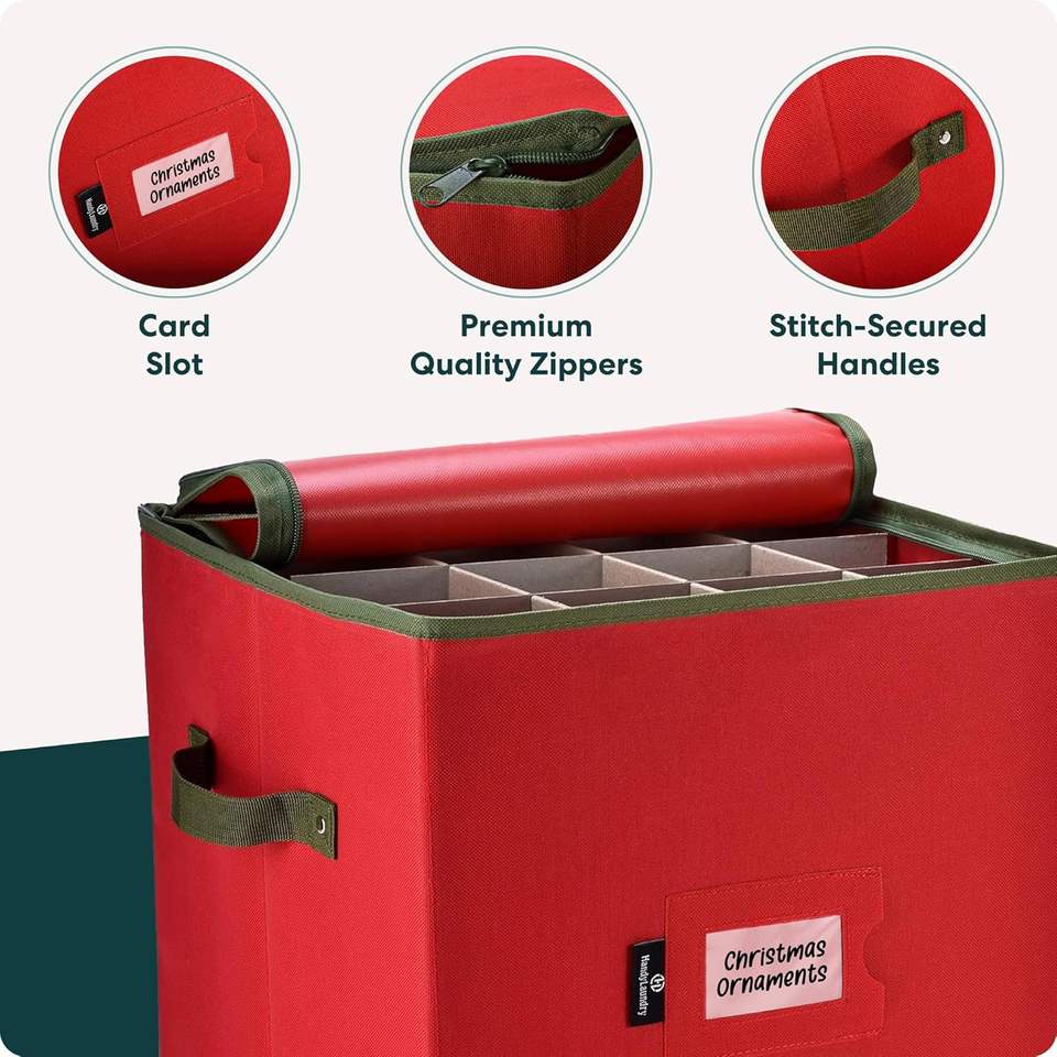 Boîte de rangement pour ornements de Noël, capacité de 64 ornements, diviseurs ajustables multifonctionnels, fermeture à glissière, deux poignées de transport