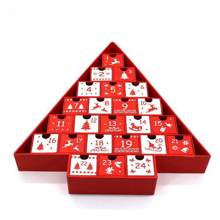 Boîte-cadeau de calendrier de l'avent de Noël avec rennes et arbre, avec lamination mate, gaufrage, impression offset, revêtement UV, matériaux recyclés