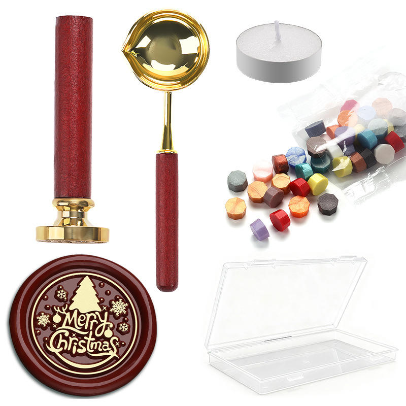 Kit de sceau de cire de Noël avec manche en bois rouge, cuillère dorée, granulés de cire, boîte transparente 100g, ensemble de sceaux artisanaux ronds