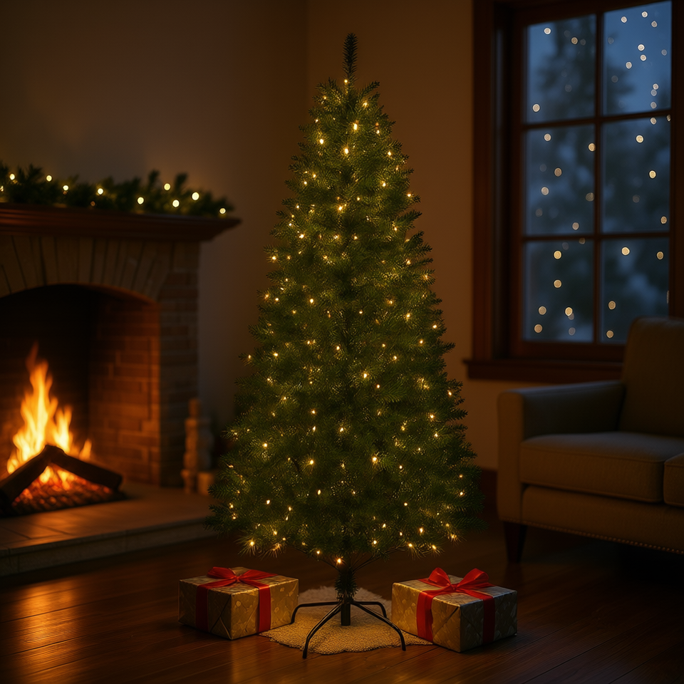 Sapin de Noël de 7,5 pieds, fin, pré-éclairé avec lumières LED blanc chaud, base autoportante pour intérieur, installation facile, en plastique