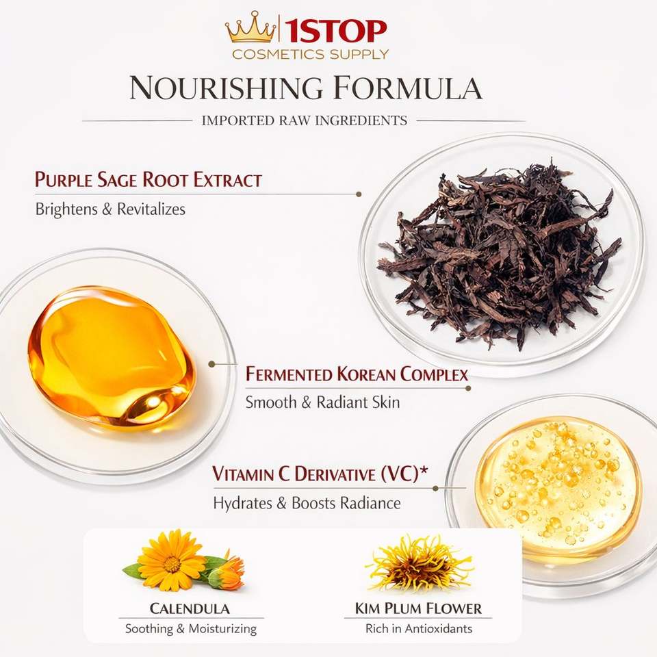 Squalène, Thé vert, Sel de la Mer Morte, AHA, Acide kojique, Algue, Peptide, Vitamine C, Acide hyaluronique, Beurre de bassie, Aloe Vera, Camélia, La glycyrrhizineIngrédient principal