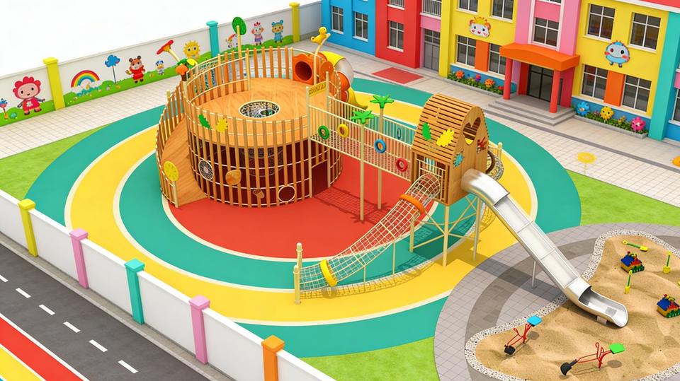 Ensemble d'aventure Château Circulaire et Toboggan en Plastique - Équipement de Jeu Extérieur en Bois et PE Haute Capacité pour Parc et Jardin