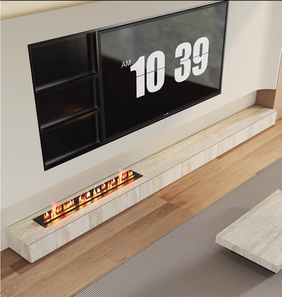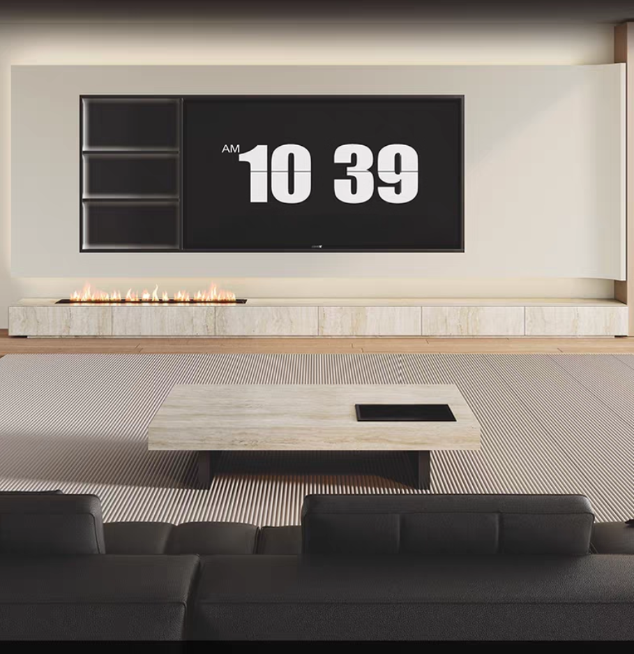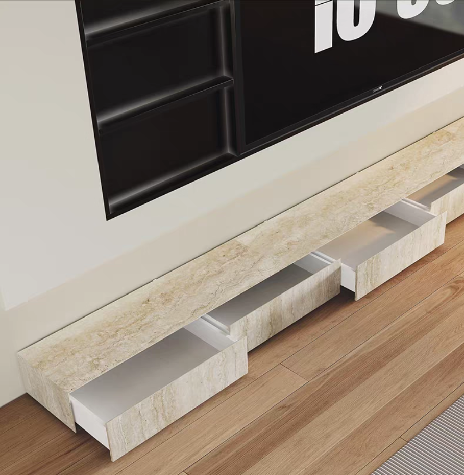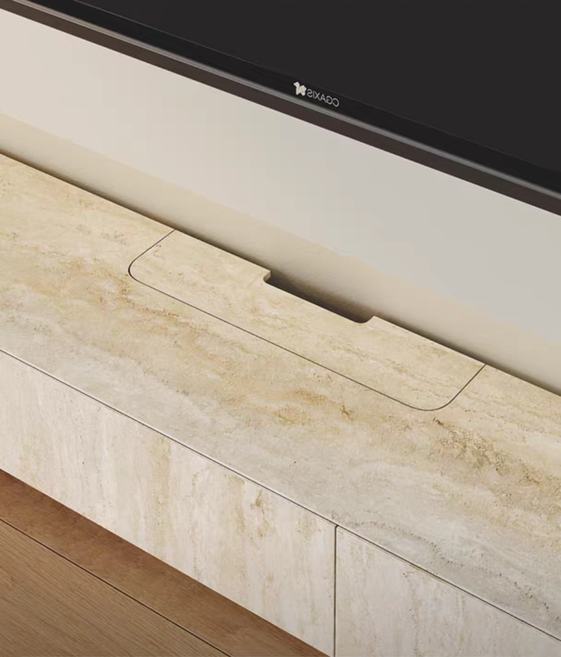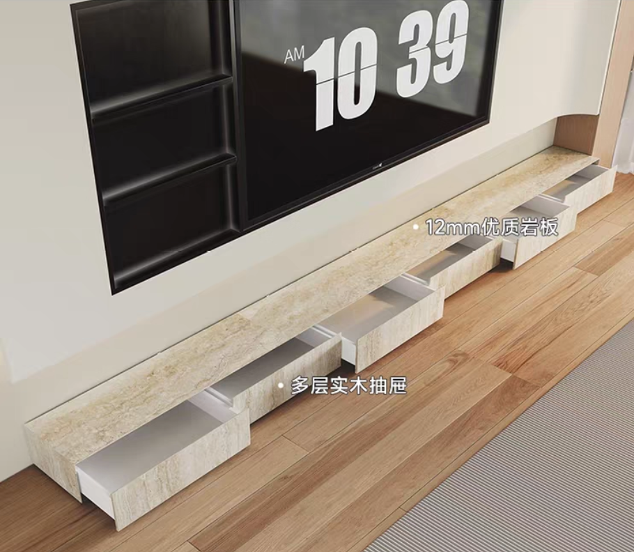 Meuble TV en bois moderne avec panneau en pierre d'angle Haitang circulaire, meuble au sol/plafond, courbe cintrée personnalisée, salon, hôtel