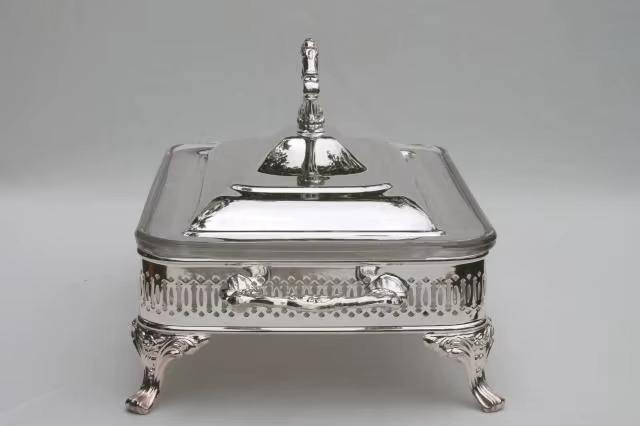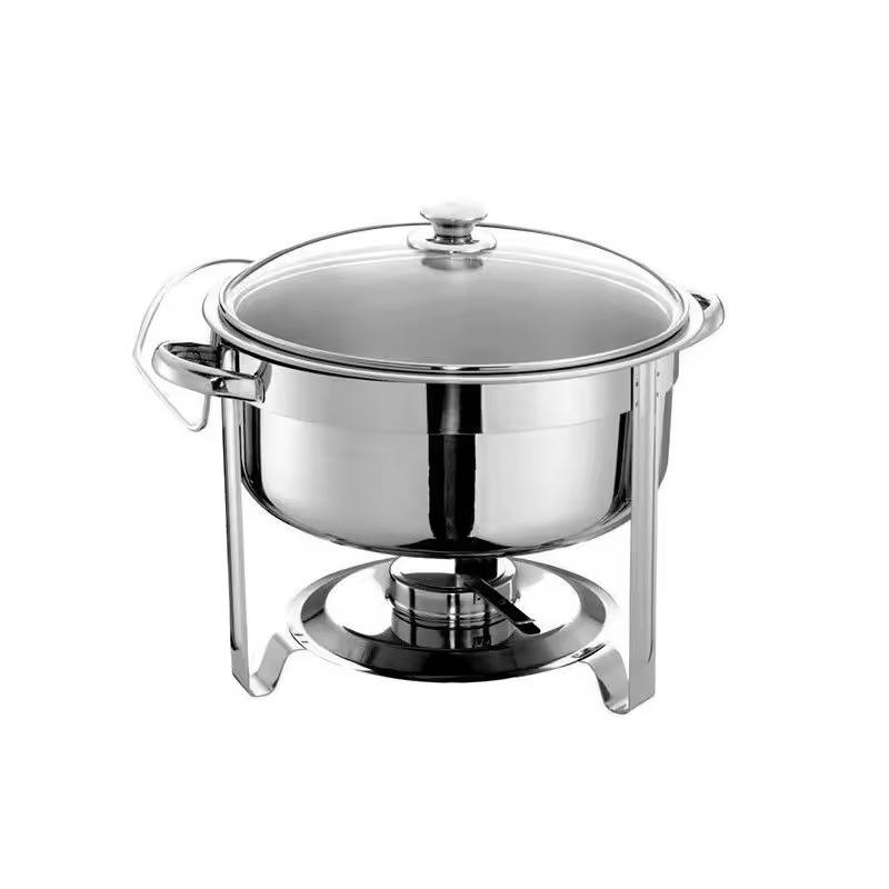 Plat à chafing en acier inoxydable à motif circulaire avec couvercle en verre pour équipement de restauration, magnifiquement conçu par KHOOSI OVERSEAS