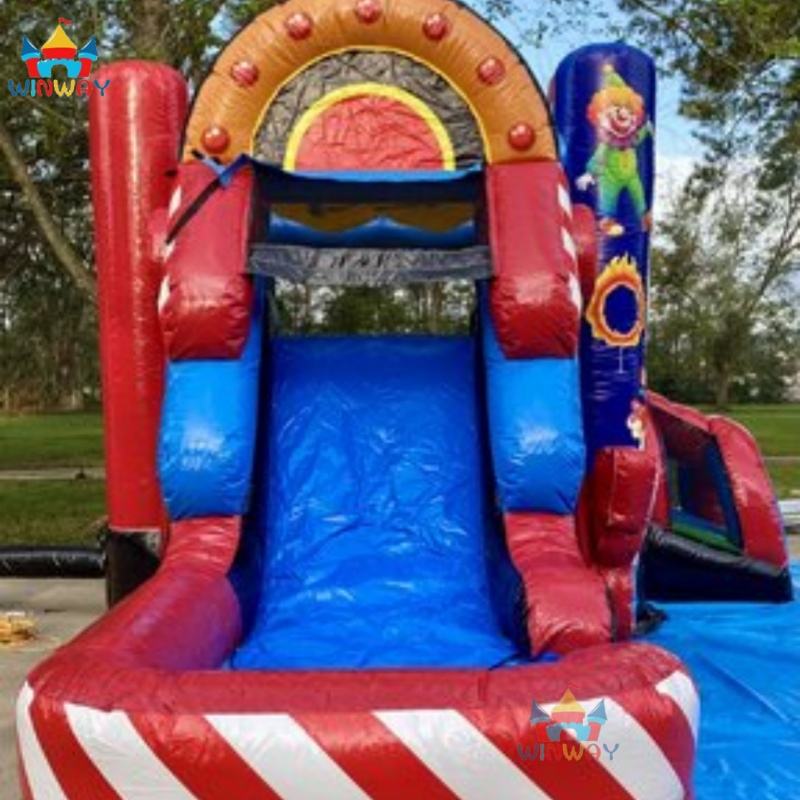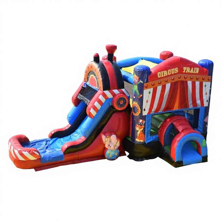 Location de château gonflable sur le thème du cirque avec structure en PVC, installation facile et capacité de 5 à 10 personnes - Combo aire de jeux et train pour le plaisir