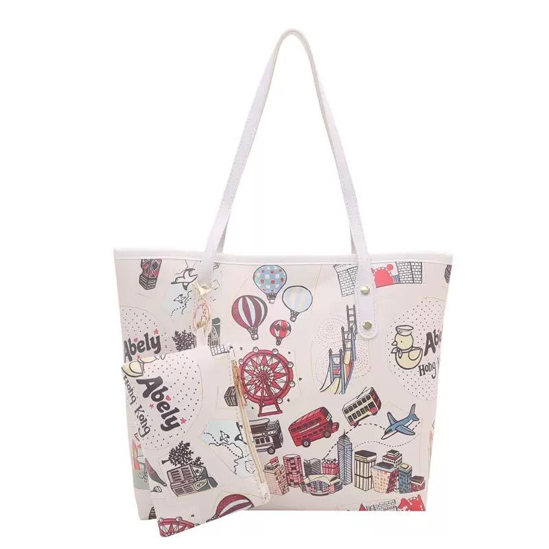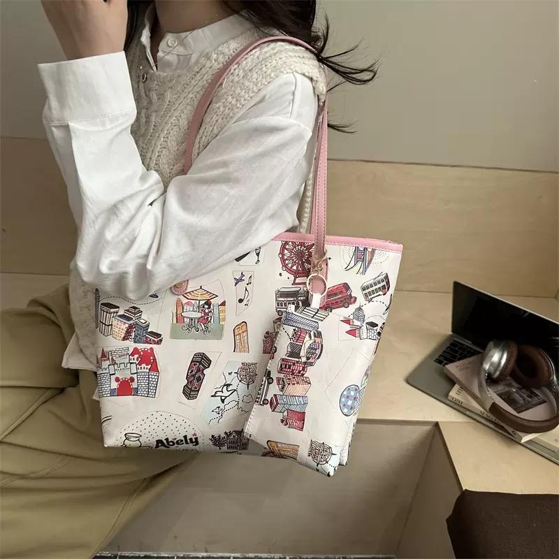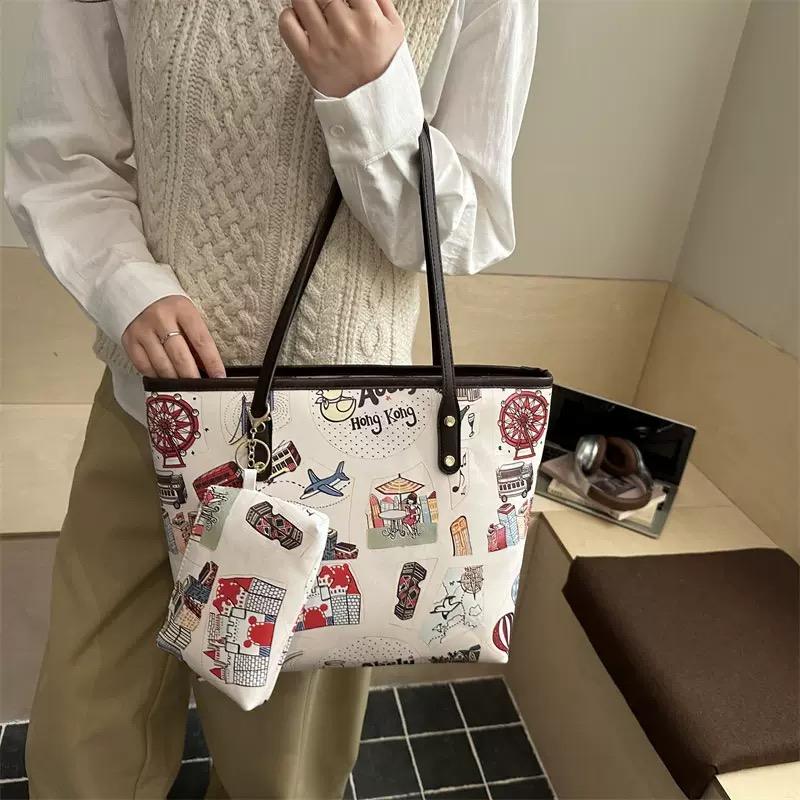 Sac fourre-tout imprimé paysage urbain avec pochette assortie, sac à bandoulière vintage avec illustration de voyage pour femme
