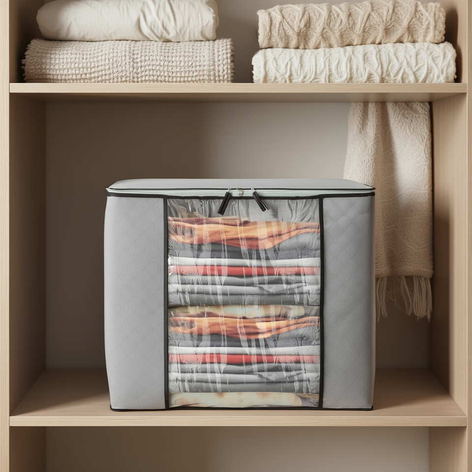 Sac de rangement pour vêtements Cjsb 90L gris avec double fermeture éclair et fenêtre transparente pour couettes, couvertures et literie