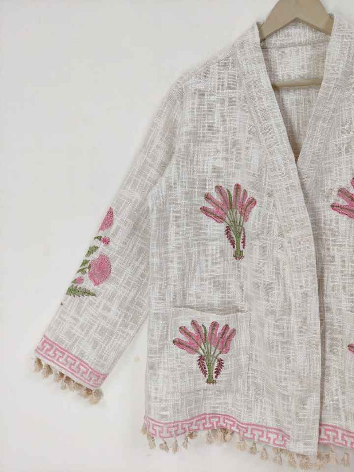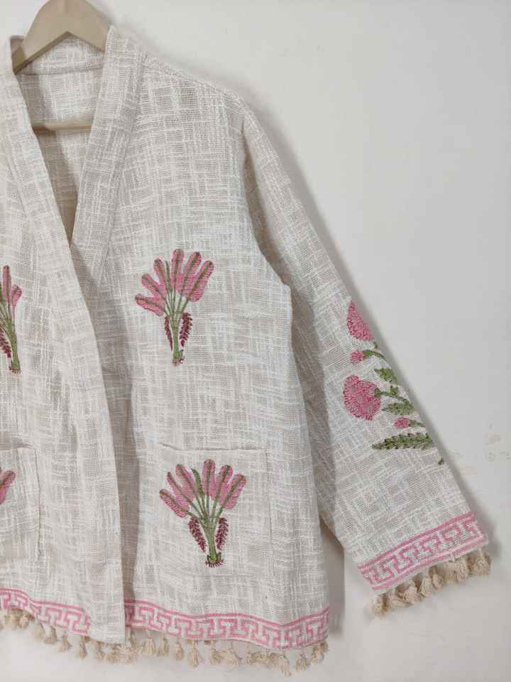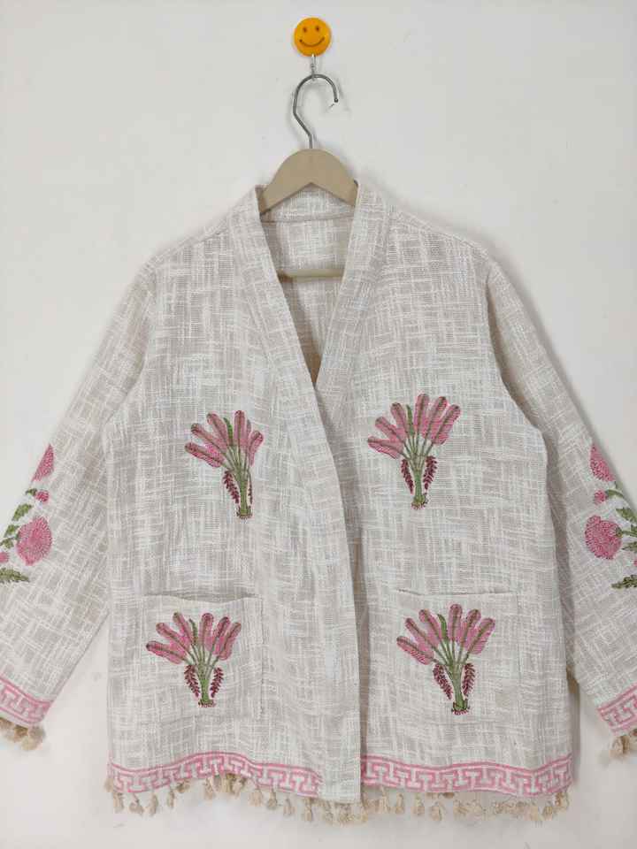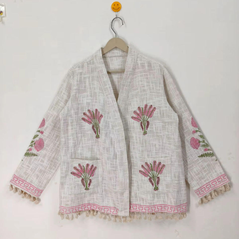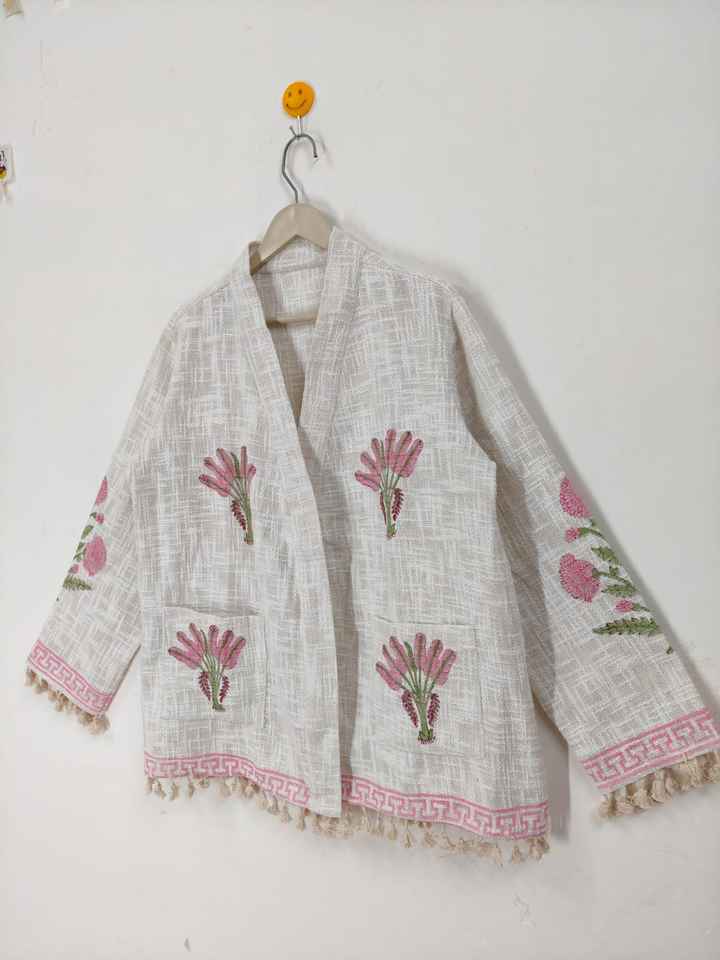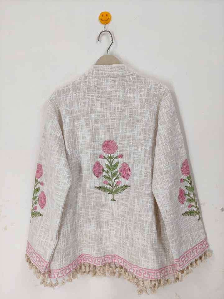 Blouson bomber classique en coton imprimé à la main, réversible, écologique, respirant, design floral bohème d'hiver, court