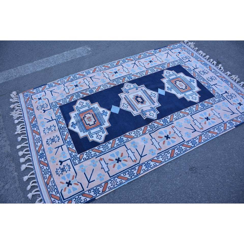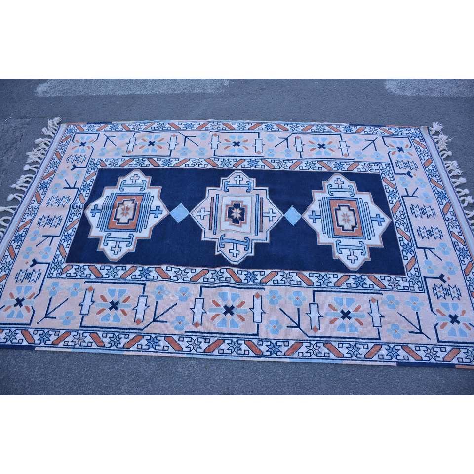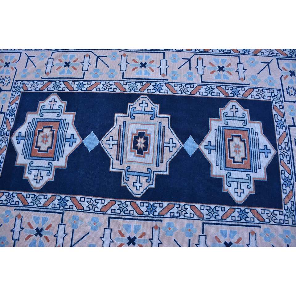 Classique Bleu Beige Patchwork Laine Tapis 4.1x 6.6ft Vintage Turc Design pour Salon Décorations Latex Soutenu 9x12
