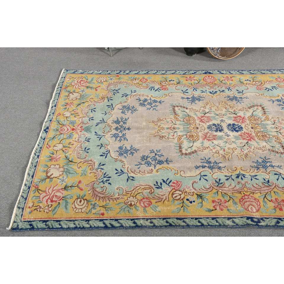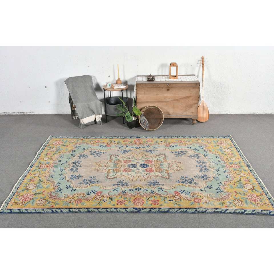 Classique Bleu Beige Vintage Tapis Turc 5.6X9.2 pieds À La Main Patchwork Conception Laine Bambou Soie Latex Salon Couloir Rectangle