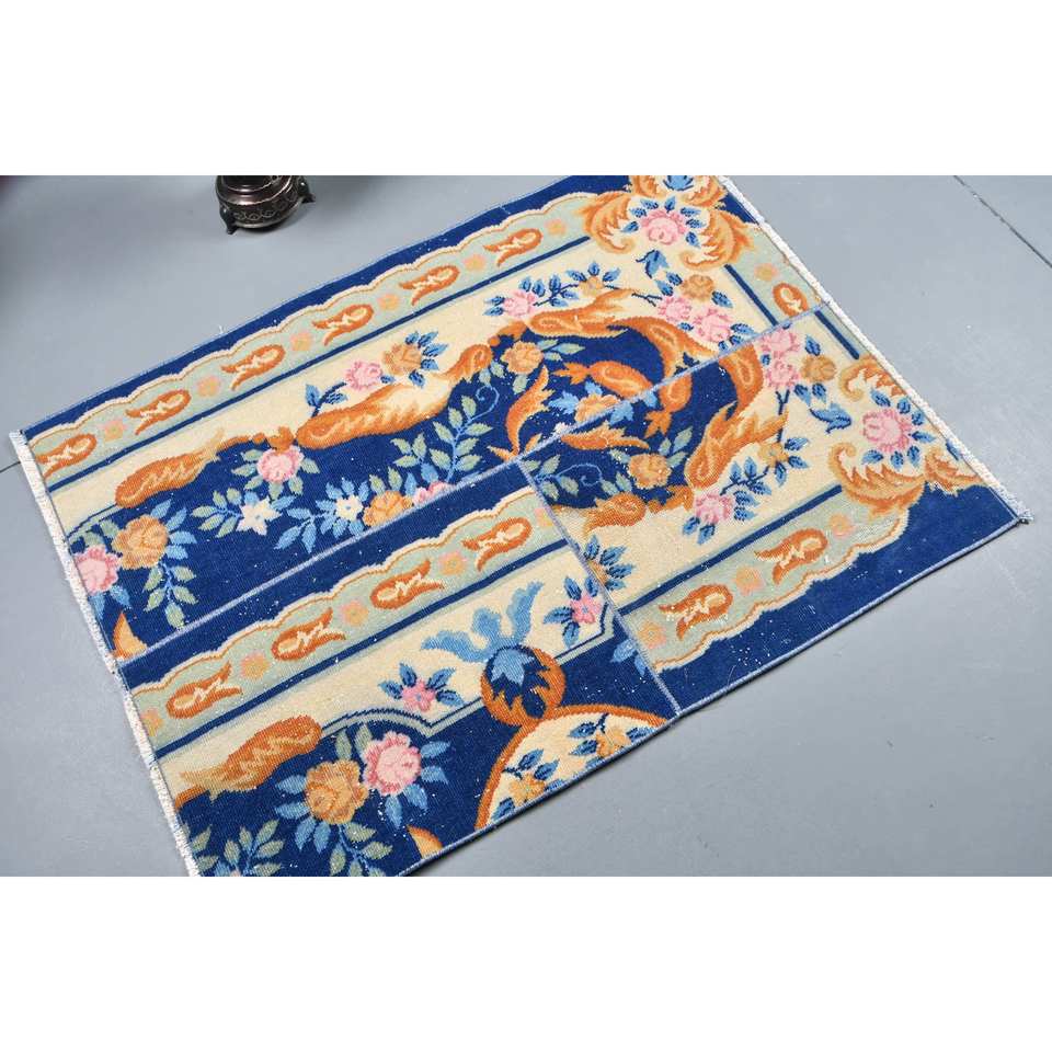 Tapis turc vintage bleu orange classique 3x4ft laine grande surface avec motif abstrait pour adolescents support en latex pour utilisation dans le couloir