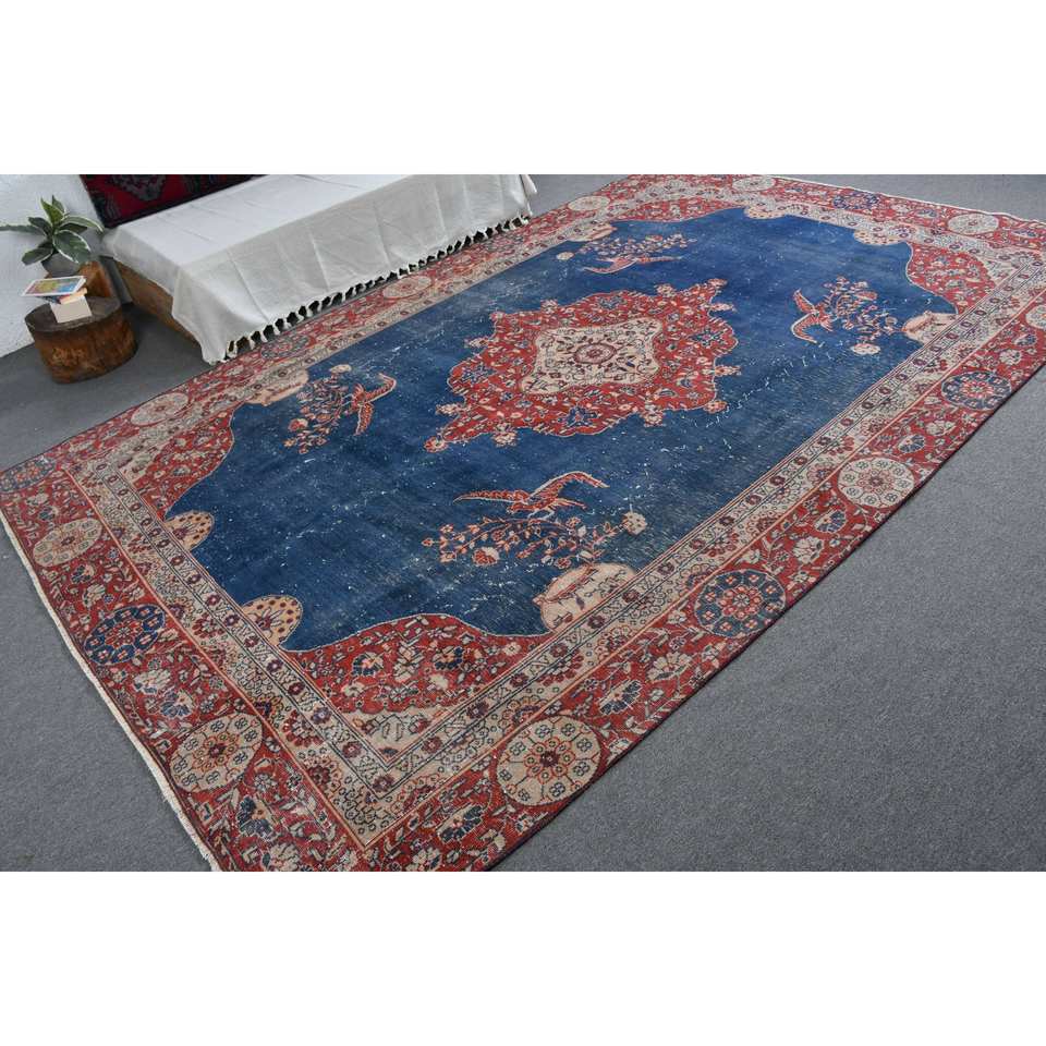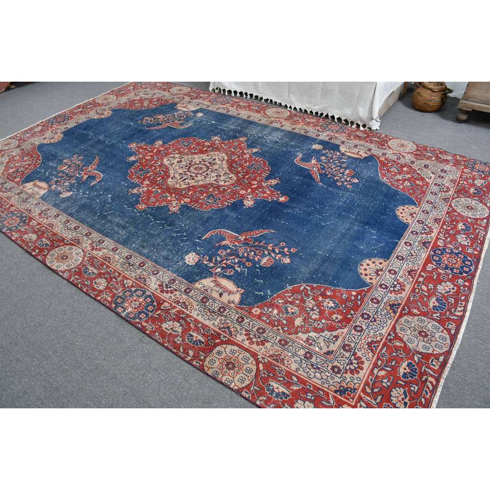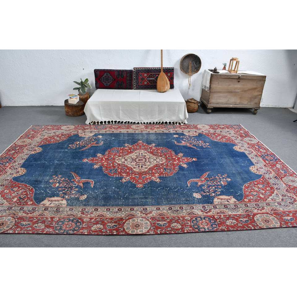 Tapis rectangulaire classique en laine bleu et rouge, grande surface, 7,3 x 11,2 pieds, écologique, turc, pour salon, avec envers en latex, patchwork