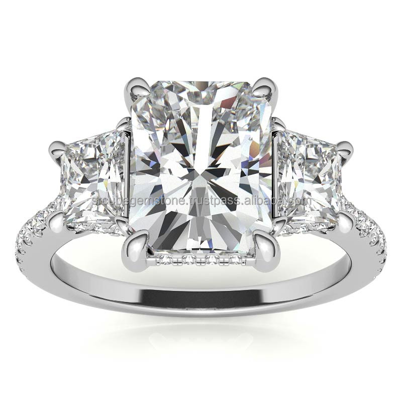 Conception classique émeraude et trapèze 3 pierres Moissiante belle bague en diamant pour les cadeaux de mariage avec Gra certifié en Vvs
