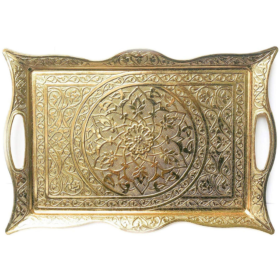 Plateaux en métal marocains au design classique, plateaux à thé en cuivre faits à la main, plateau de service de luxe en métal gravé avec poignées, style arabe