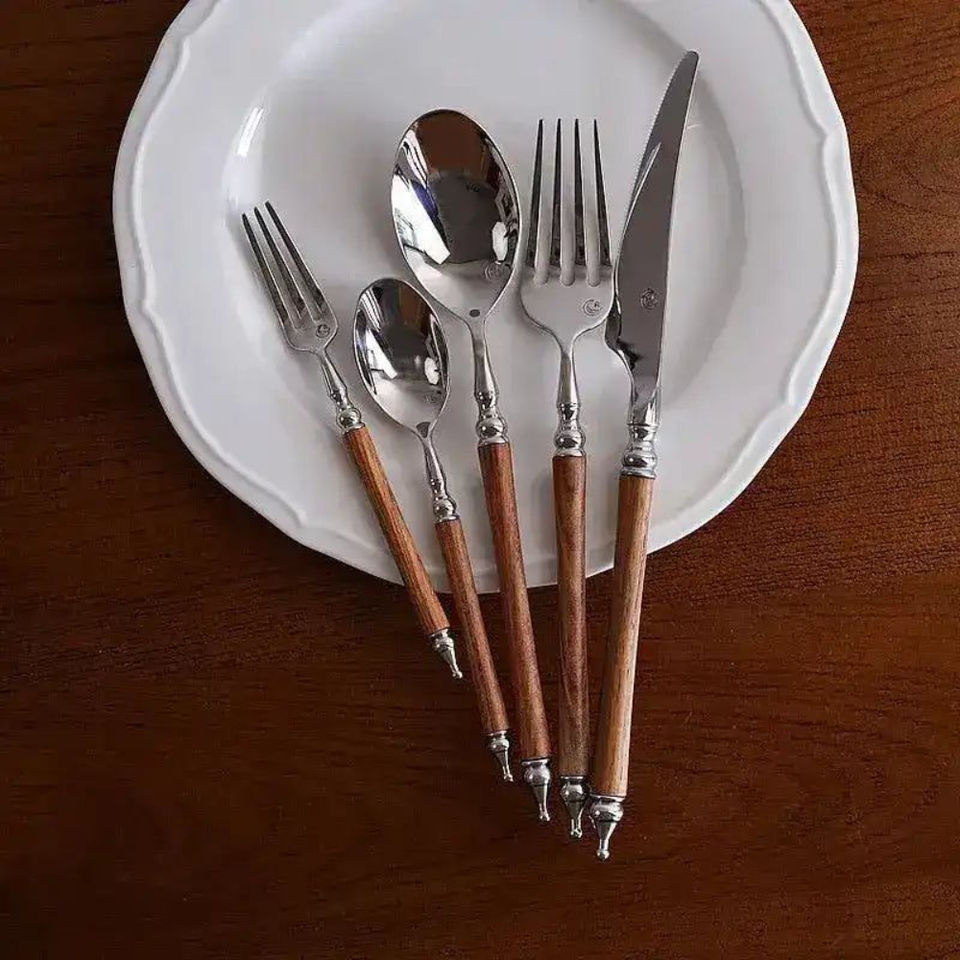 Ensemble de couverts de table au design classique, qualité supérieure, en acier inoxydable avec manches en bois, pour usage domestique et hôtelier
