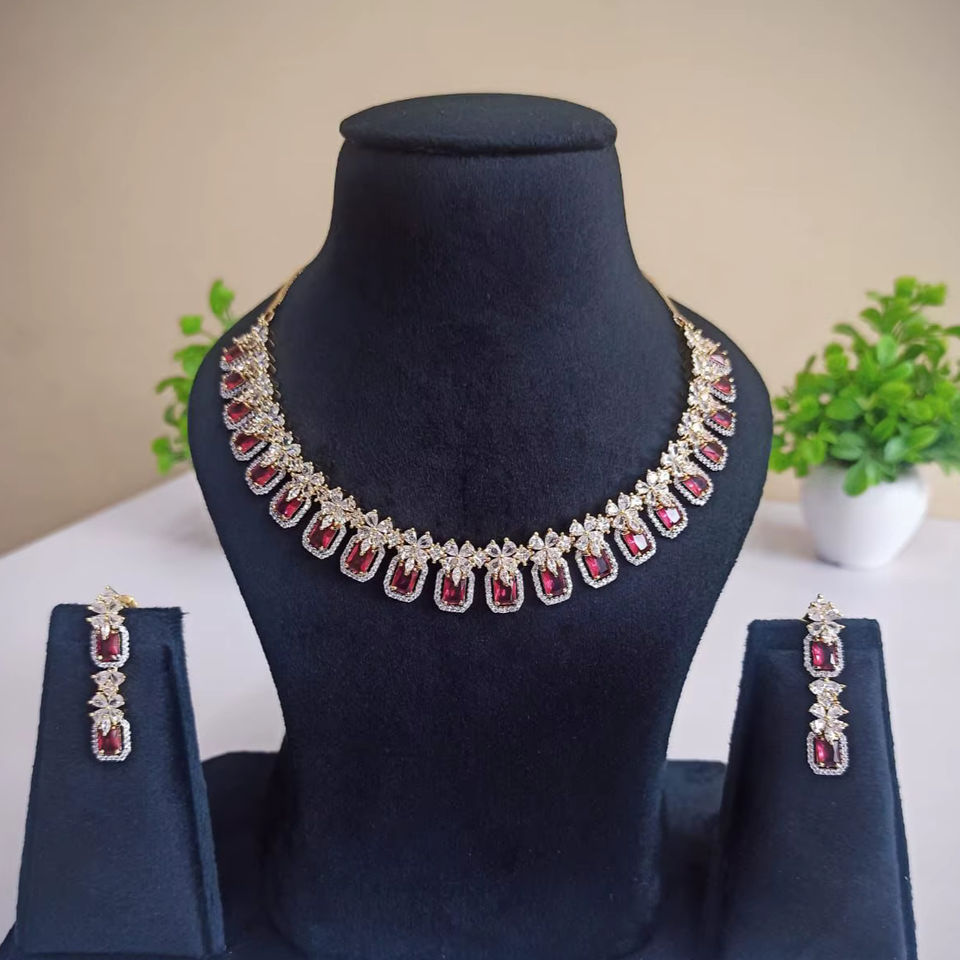 Parure de bijoux de luxe plaqué or rose style classique avec cristaux rouges, boucles d'oreilles et collier chandelier pour mariée