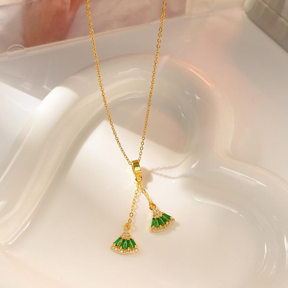 Collier pendentif classique en forme d'éventail avec pierres précieuses et strass, plaqué cuivre, or véritable, avec pompon