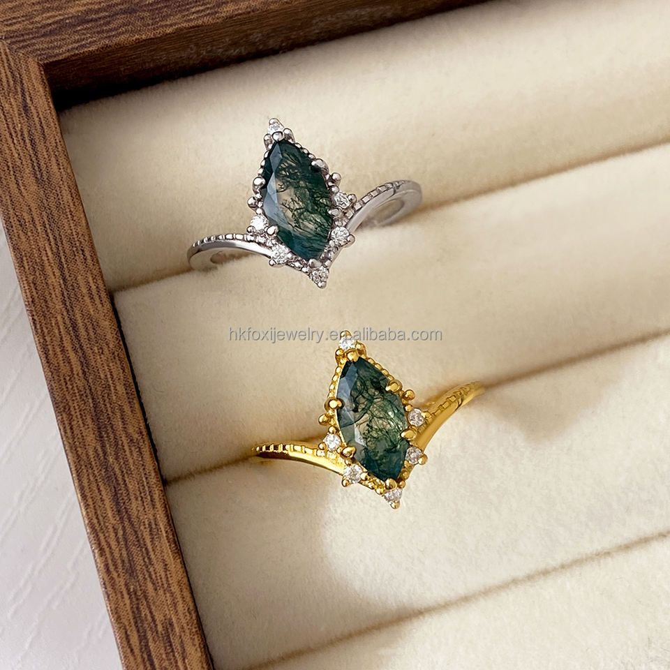 Bagues classiques à la mode en laiton avec zircon et pierre naturelle, pierre de mousse verte, agate, bague empilable pour femmes, mariage, plaqué or 14 carats