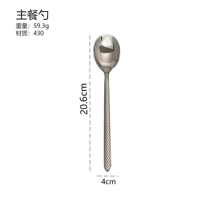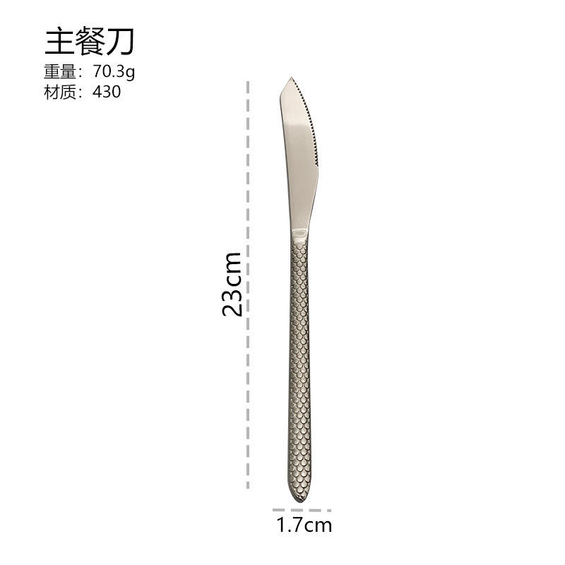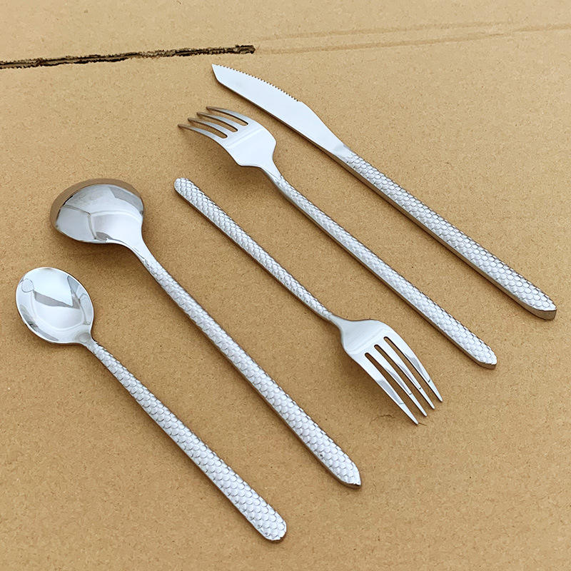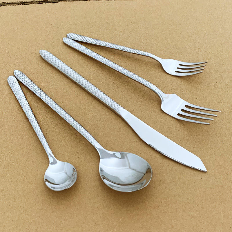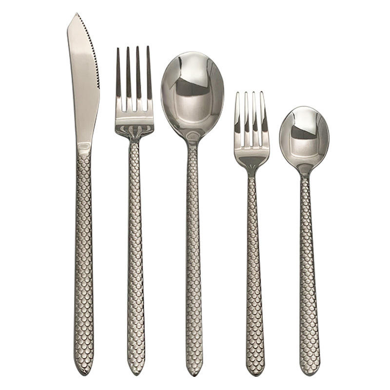 Ensemble de couverts classiques à poignée texturée écailles de poisson, en acier inoxydable 18/0, finition argent miroir, couteau, fourchette et cuillère pour mariage et réception
