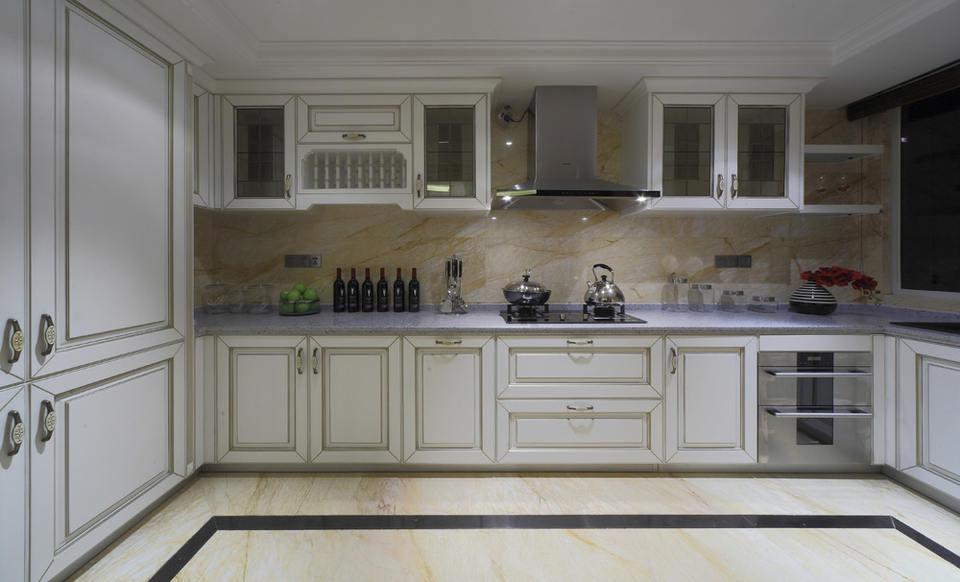 Armoire de cuisine de style français classique, porte en verre, placage de luxe, structure en MDF, évier intégré, accessoires de tiroir de cuisine